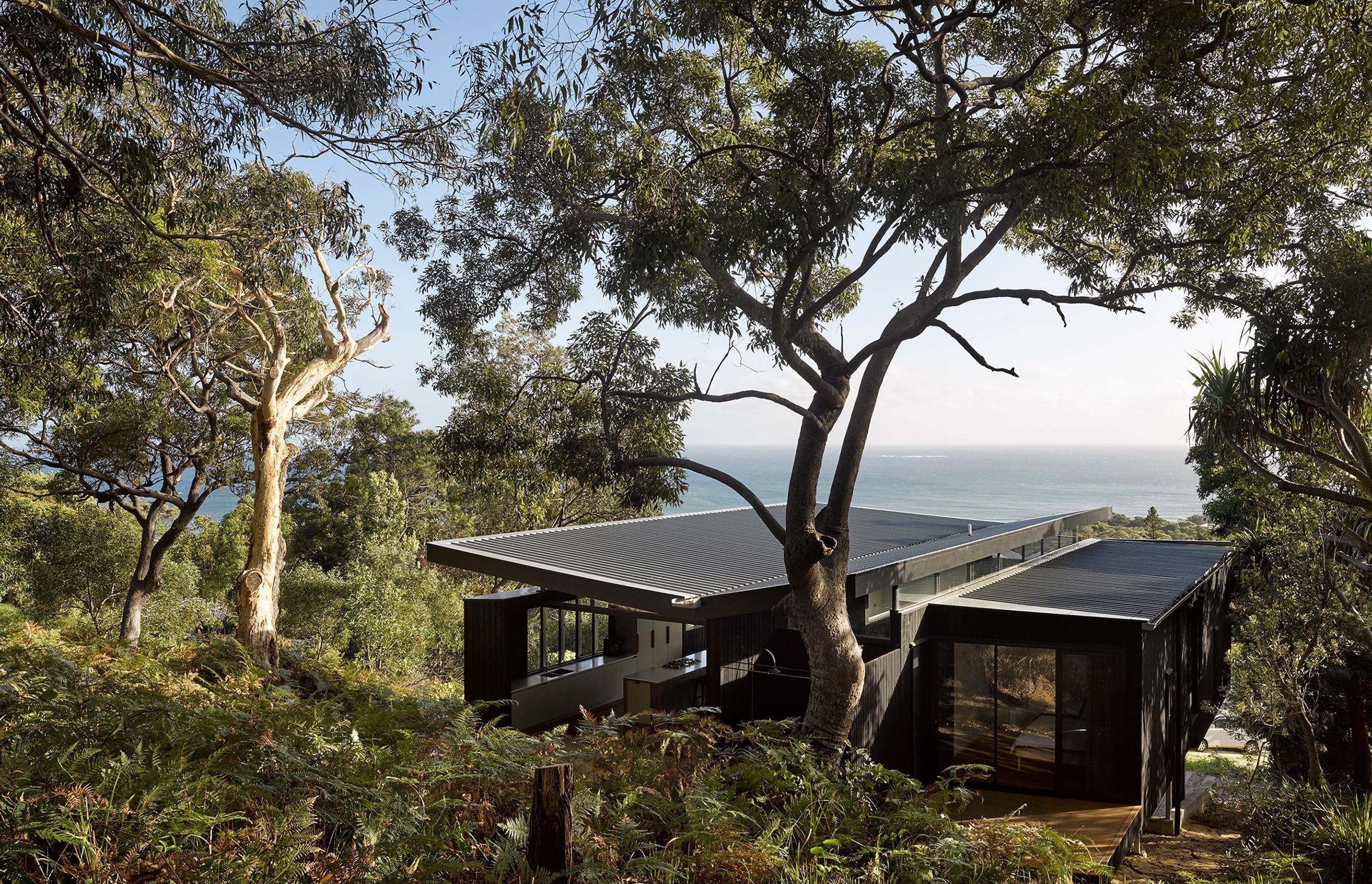 The home is clad in charred timber from Eco Timber Group not just to comply with bushfire regulations, but also so the home would blend in seamlessly with the surrounding bushland.