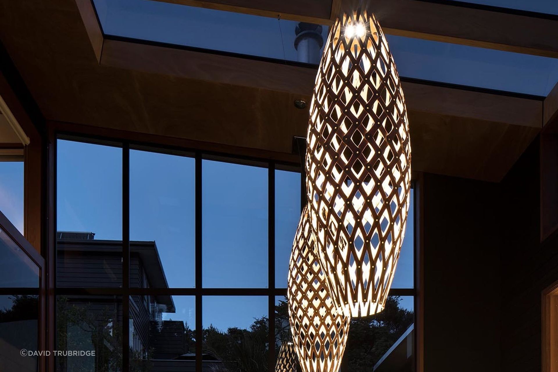 This pendant light is a modern homage to that ancient craft, reimagined through the lens of contemporary design. The light's structure is reminiscent of the woven patterns found in hīnaki traps, allowing light to escape through its geometric openings and cast a complex array of shadows, adding depth and texture to any interior space.