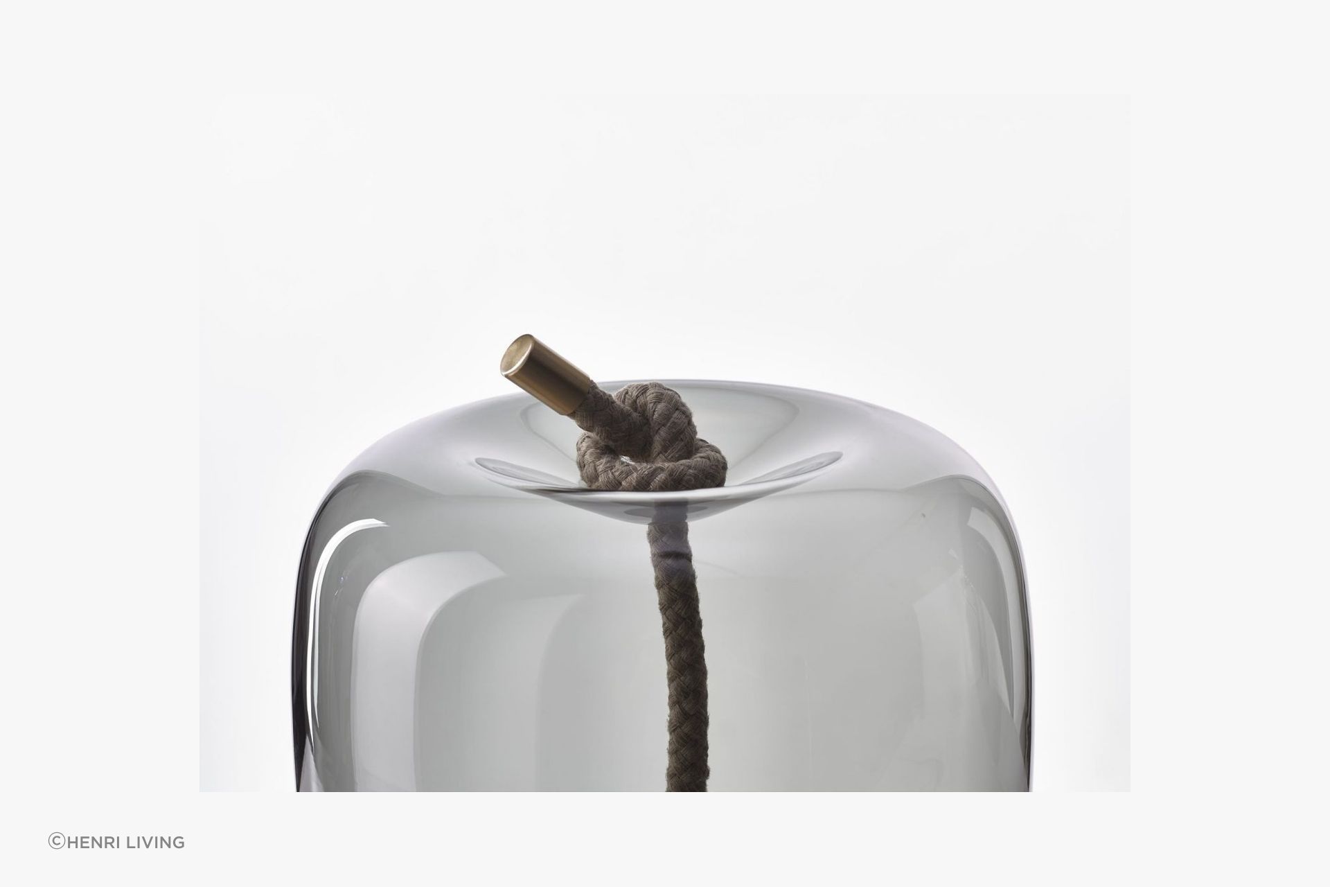 The full-bodied glass globes, available in various shapes and sizes, are intriguingly deformed by the robust cords. These cords, which appear to cinch the glass, creating a unique inward pull at the bottom, deliver a playful yet elegant visual effect reminiscent of soft plasticity.