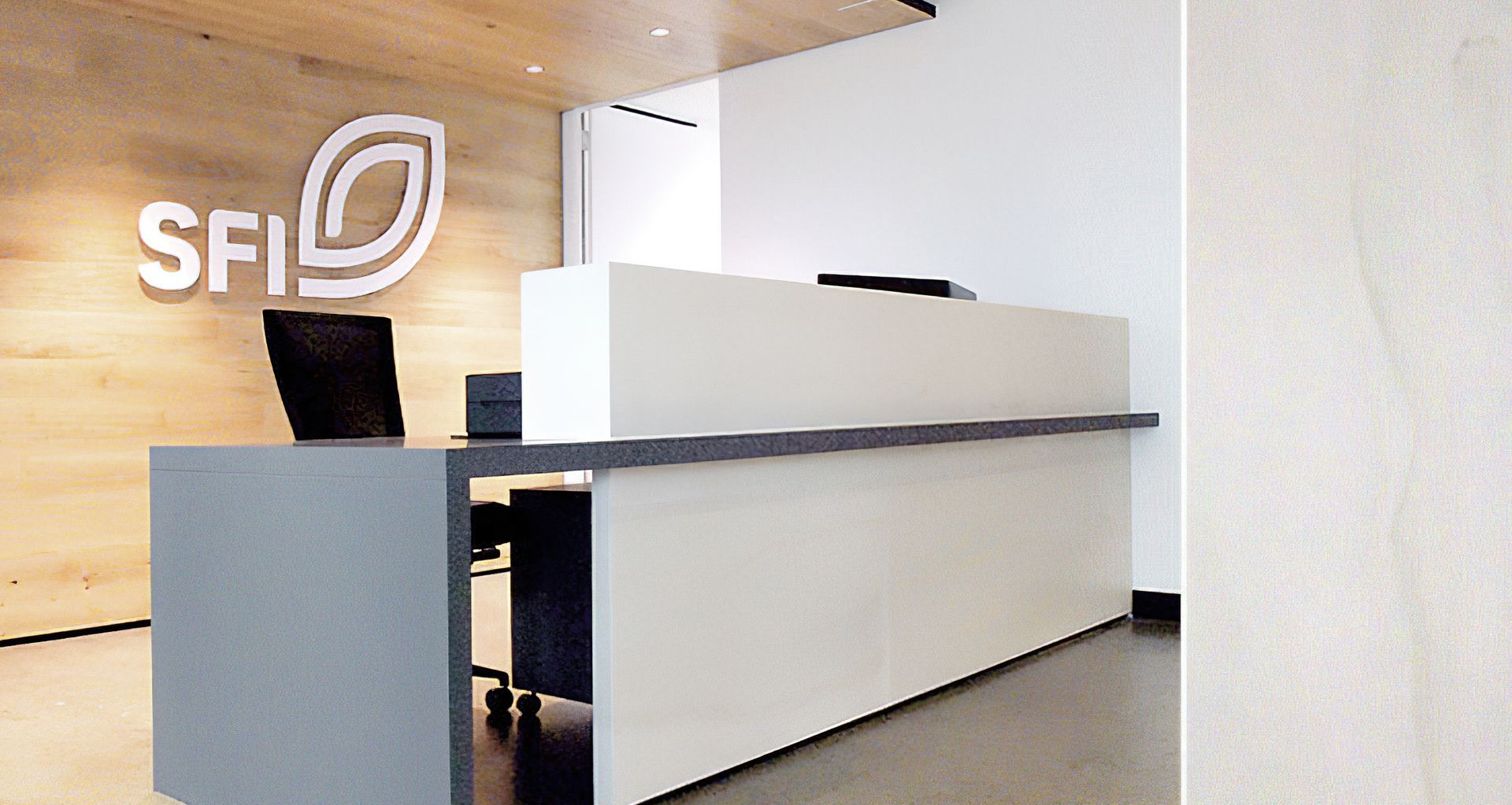 Stonini™ Delta ‘Crème Brulee’ decorative wall panels create a clean yet organic look in the SFI reception area in the global headquarters at St Leonards.