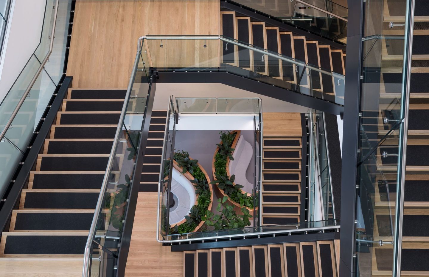 In the Suncorp building, the stair cuts through four levels, which was no mean feat; the builders had to slice a stairwell through four concrete floors to accommodate it.