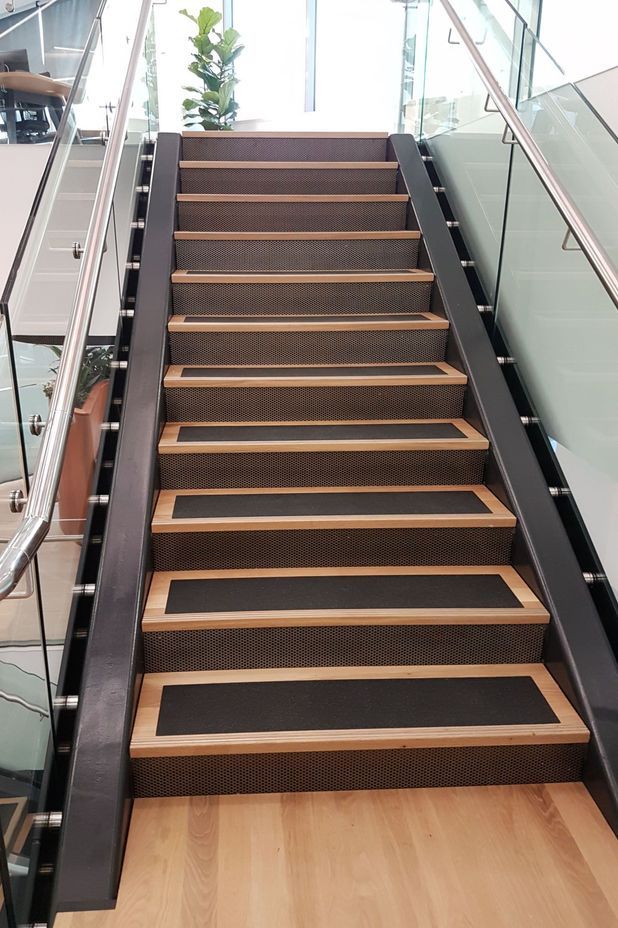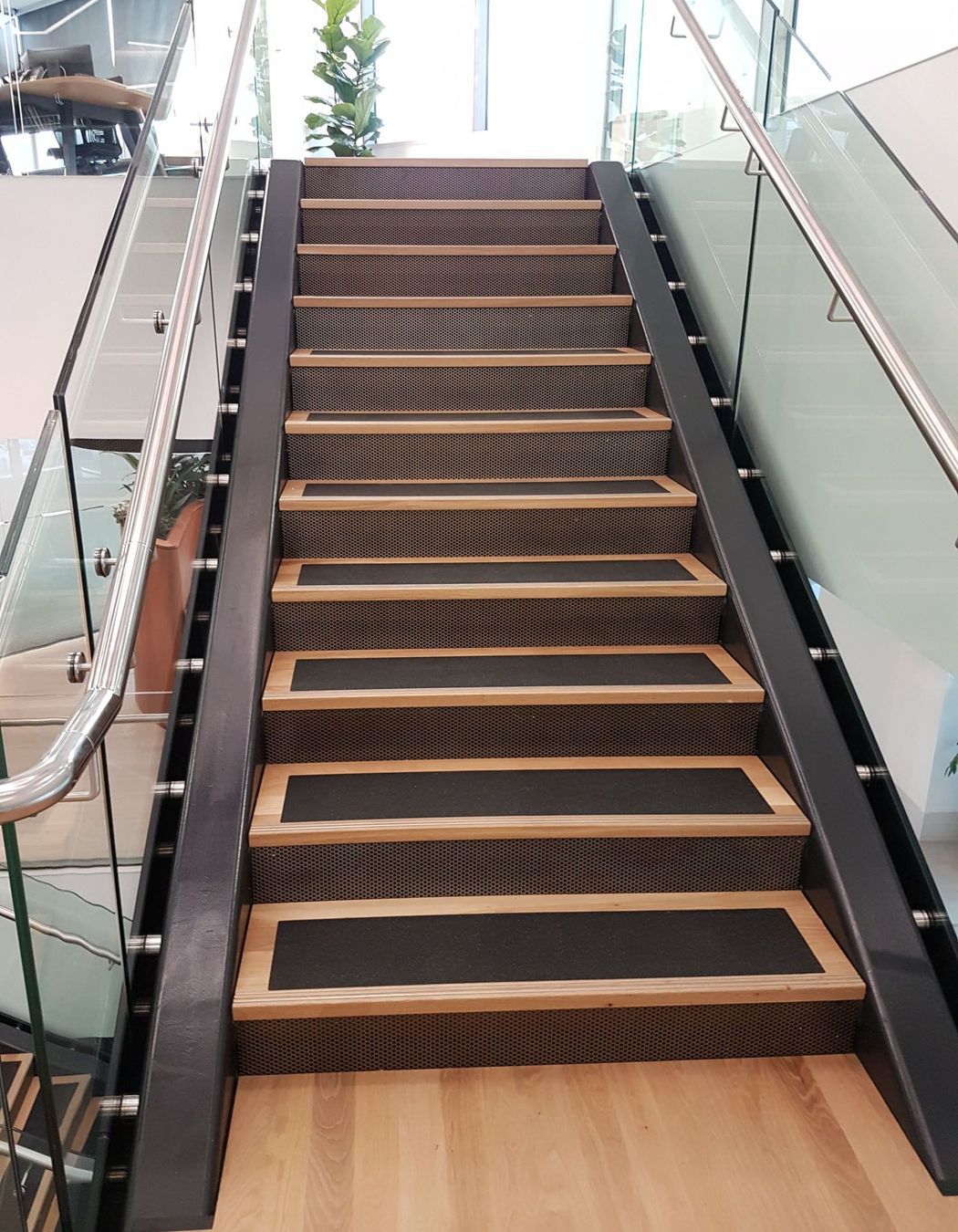 The timber treads are inlaid with a rubber grip pad on each step and two metal strips on the nose of the tread, in order to comply with health and safety requirements.