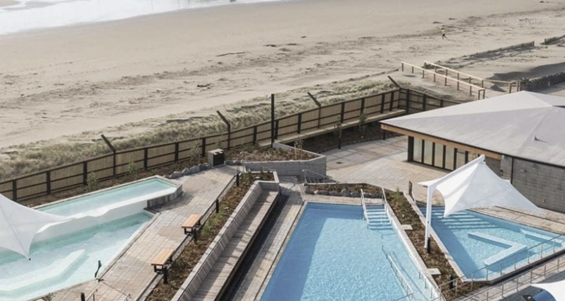 He Puna Taimoana pools is part of the $19.2 million New Brighton Regeneration project, led by Development Christchurch Ltd (DCL), which has the aim of transforming the seaside village which was extremely hard hit by the Christchurch earthquakes. The complex sits on 1900m2 of land on Marine Parade, between the new playground and the existing car park, and includes five hot salt water pools ranging in temperature from 28 to 40C and a colder, small square plunge pool. The pools are split into three zones including relax and unwind, fitness, family active zones. The facility also includes changing rooms with heated floors, a steam room and sauna and on site café called Saturdays.