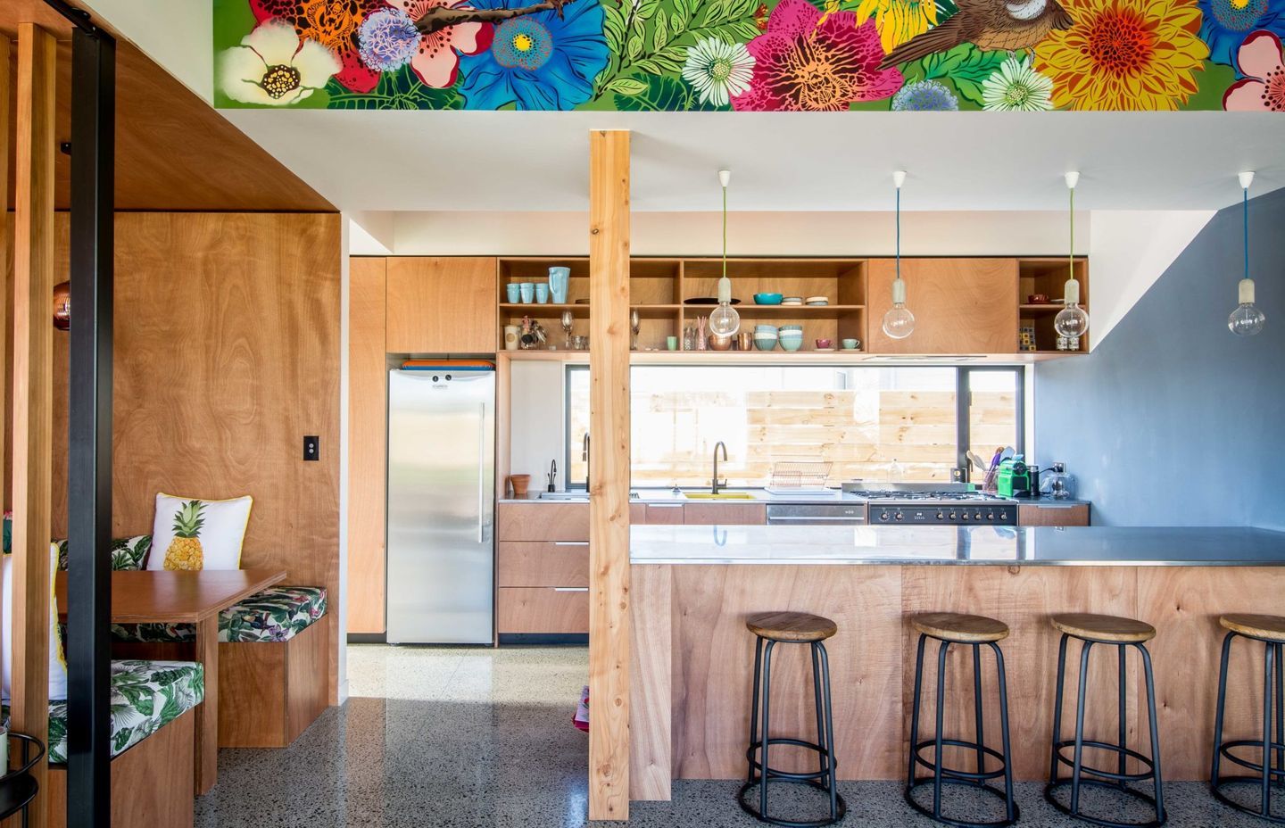 Lighting above the kitchen bench is either pendants (perhaps three different shapes/forms but in the same collection) or track lighting which suits a cleaner, more stylised look. Box tends to install lighting under high-level cupboards.