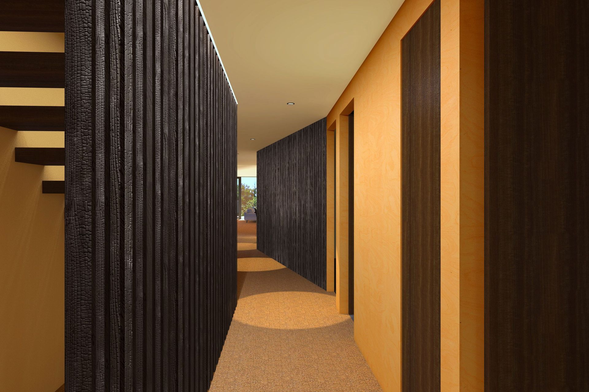 Upon entering the house, the eye will be lead down the corridor, refracted by a timber feature wall using the same charred larch as the exterior, and through to the wider open plan space. The upstairs master suite will be accessed from the main hallway via open tread stairs seemingly suspended from charred larch slats. Glimpsing through the corridor and open plan area to the outside space beyond creates an instant connection between the home and its environment. Two bedrooms, a bathroom, and guest powder room form the front of the lower floor, accessible from the right-side of the hallway, extending from the entrance. The single internal access garage will also have its entrance from the hallway.