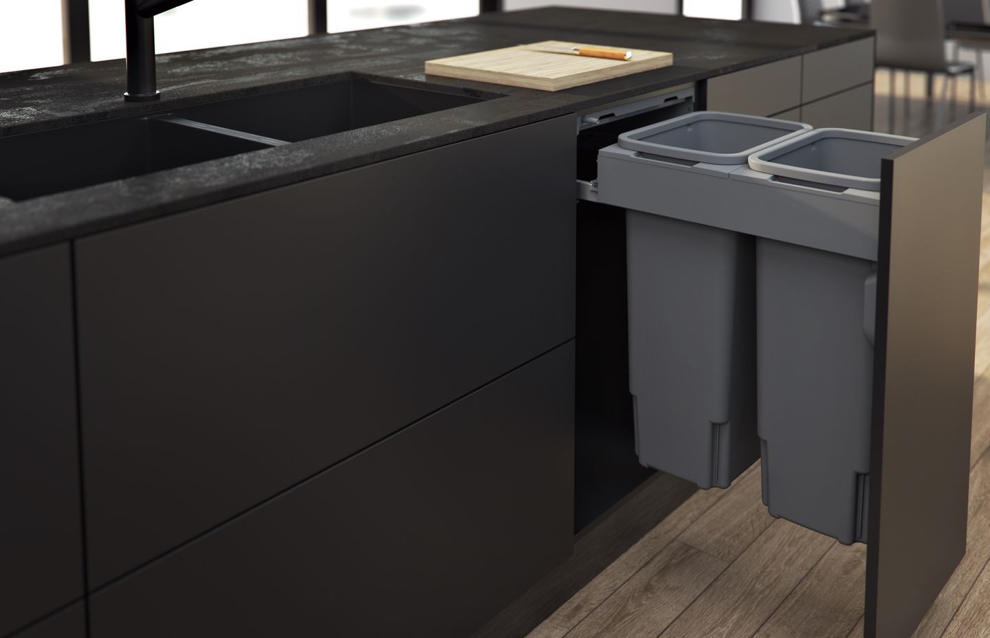 Concelo bins run on smooth synchronised runners that include a fluid damper for a seamless closing action. Like all Hideaway Bins, the runners over-extend to ensure the back bucket will come clear of the bench top.
