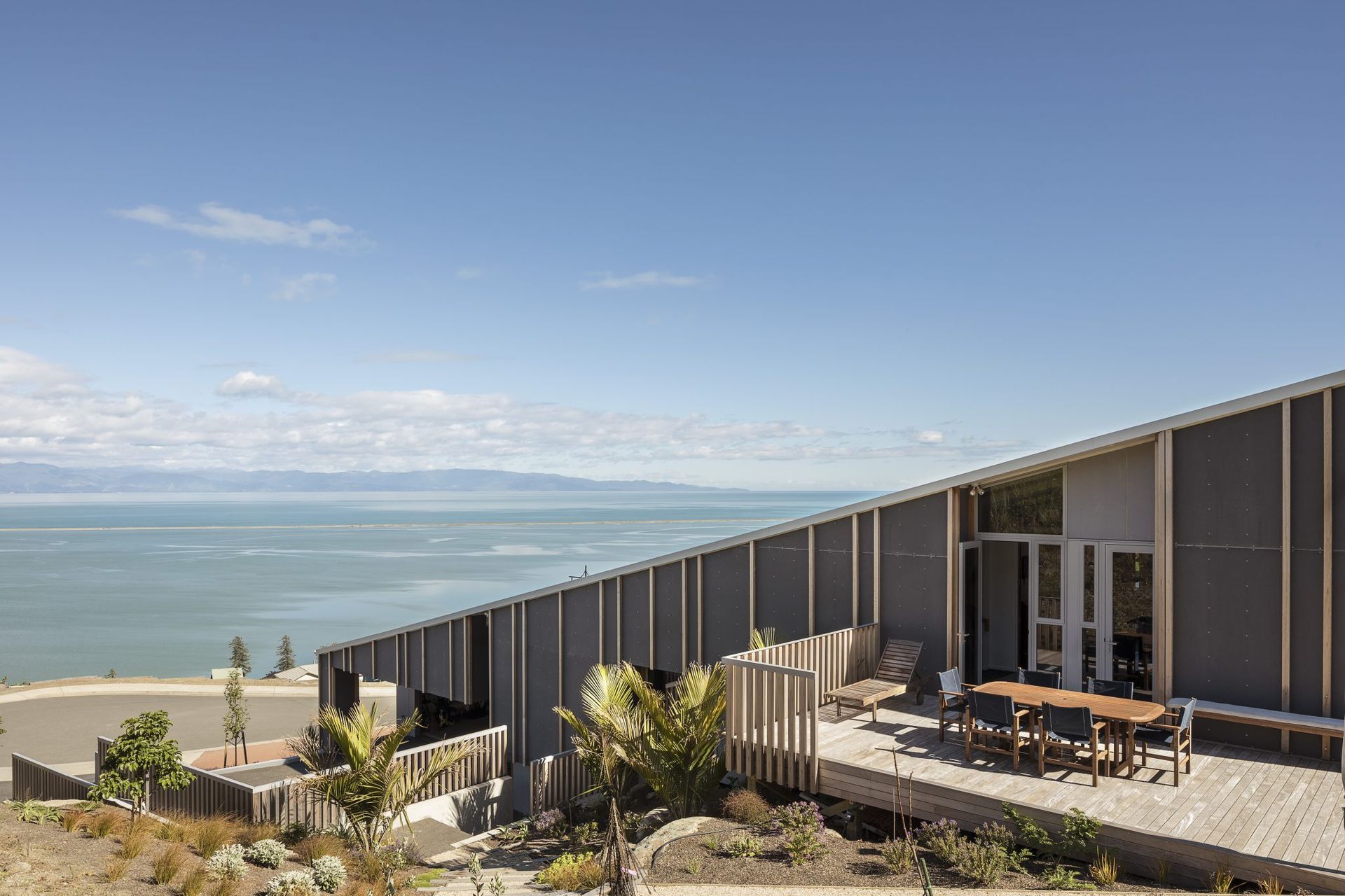 Designed to embrace the landscape, the house features three one-storey sections and a sloping roof, with spectacular panoramic views across the bay.