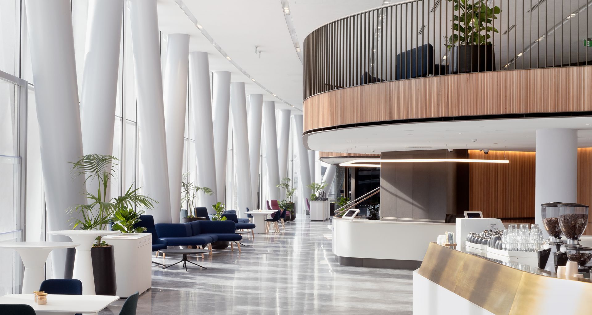 Externally, the seismically resilient A‑grade office building is wrapped in a simple sheath of smooth glass; inside, natural materials and curved formations bring a warmth to the large double-height space. For Jasmax, the design was inspired by the concept of an egg yolk nestled within an outer shell – the interior architecture adopts the flowing forms and marries bespoke lighting, artisan timber and marble finishes.