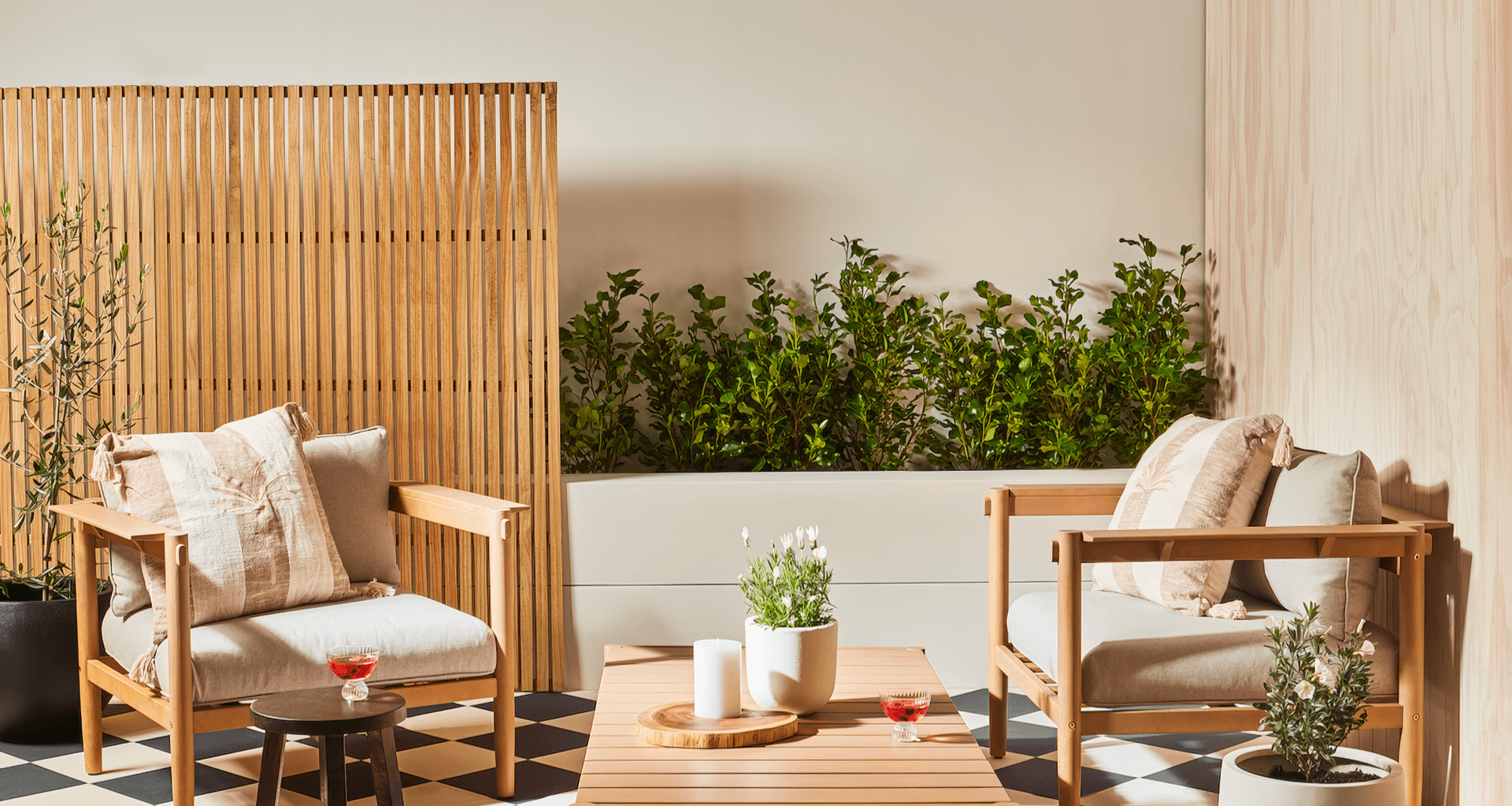 Choose a light finish like Resene Woodsman Whitewash or a deep stain like Resene Woodsman Canopy for wooden fencing or pergolas to make plantings and natural greenery pop in contrast. Then, choose similarly light and dark Resene neutrals like Resene Thorndon Cream and Resene All Black for the painted surfaces to tie the look together. Back wall painted in Resene Eighth Thorndon Cream, right wall stain washed in Resene Woodsman Whitewash, planter box in Resene Half Thorndon Cream, chequered floor in Resene Walk-on tinted to Resene All Black and Resene Thorndon Cream, trellis screen in Resene Furniture and Decking Oil, chairs and coffee table in Resene Waterborne Woodsman Limed Oak, stool in Resene Woodsman Cedar Natural Wood Oil Tararua, dark plant pot (left) in Resene All Black, small pot (on table) in Resene Eighth Thorndon Cream, light plant pot (right) in Resene Half Thorndon Cream and decorative trivet in Resene Kaimanawa.