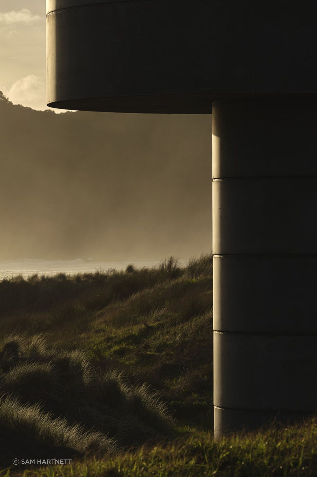 And so it does. Te Pae Surf Life-saving Tower perches quietly amongst the black-sanded dunes of North Piha Beach — its small footprint touching the earth lightly. The base of the tower is made from precast sections that enclose the steel spiral staircase as it ascends to the main floor, which cantilevers out toward the sea.