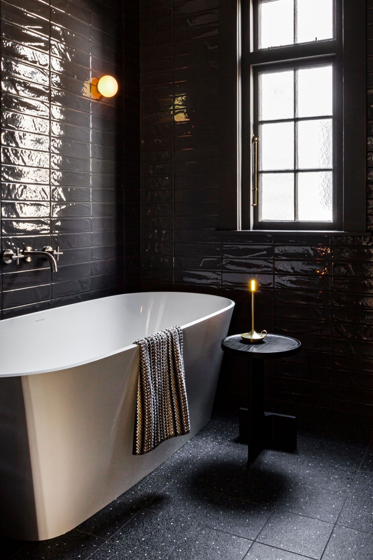 Most importantly it’s a sanctuary, with a bath, a double rainhead shower and places for candles. That cosy feeling is why the glossy dark tile was chosen. “It’s actually a graphite grey,” says Rose. “They reflect each other and intensify and the colour changes depending on the time of day.”