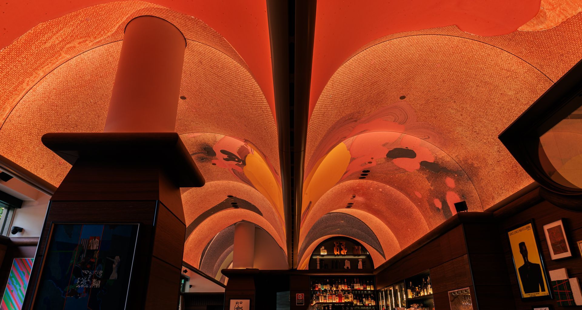 At Bar Julius in Surry Hills, a vibrant ceiling is brought to life through Barrisol’s cutting-edge “Print Your Mind” technology, showcasing the power of feature ceilings in contemporary interior design.