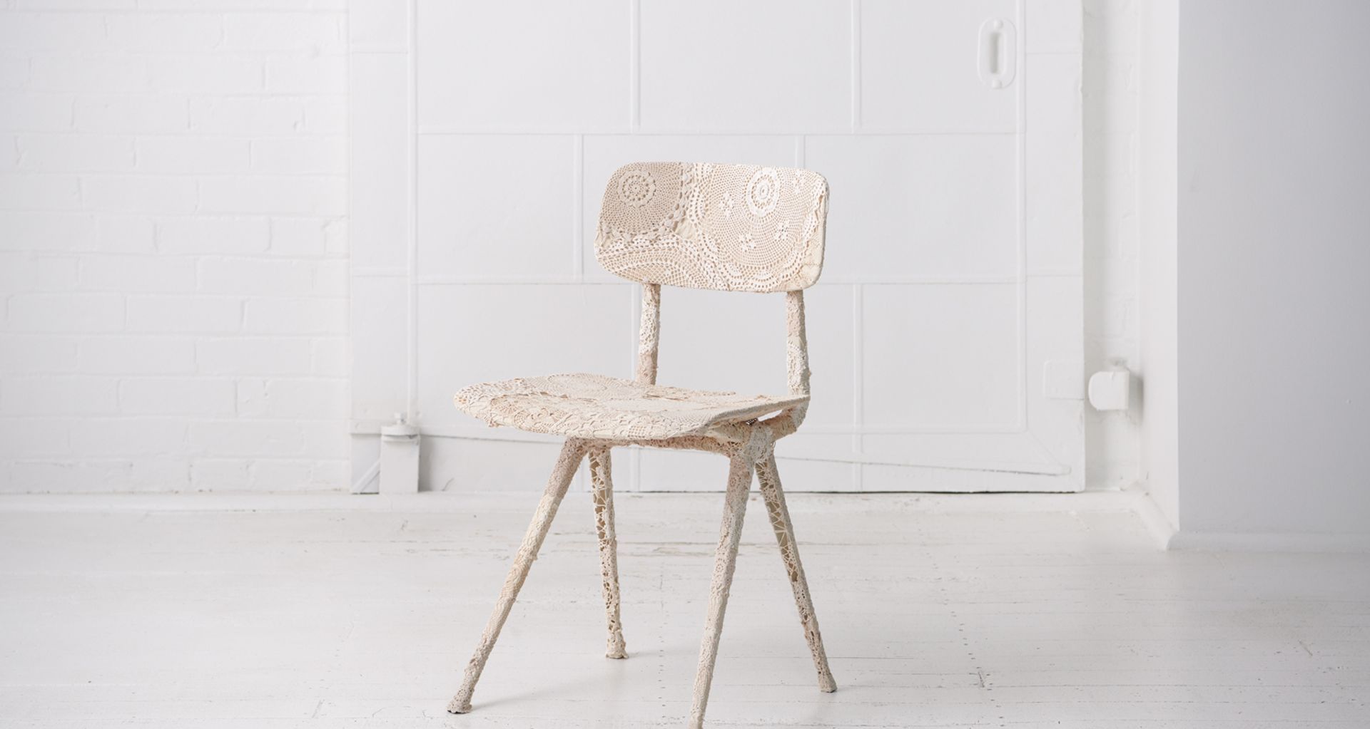 This chair covered in a mycelium of yarn, crocheted, dyed and sewn together by generations of female hands are to represent connectedness and how the awareness of this and the force of good that is the source of all will naturally and effortlessly lead us on the path to make good and design the world we want."