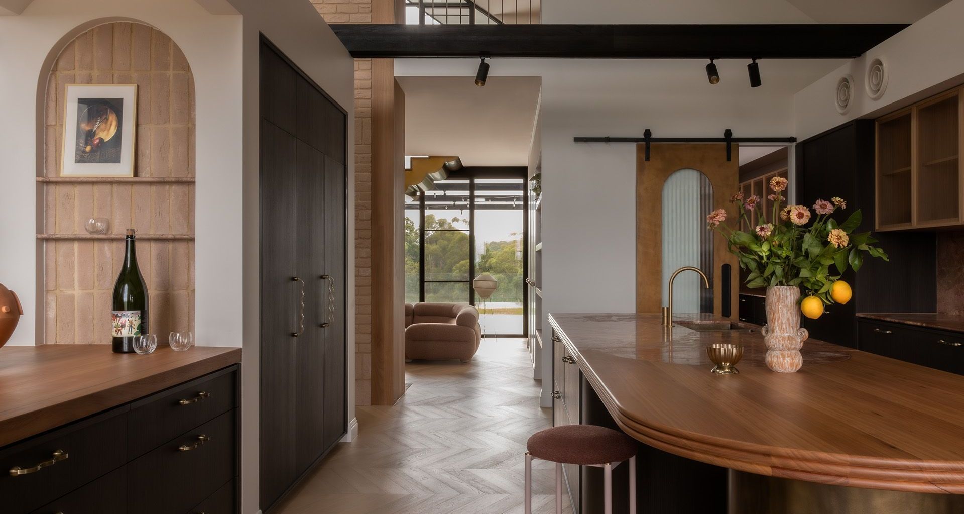 At its heart, The Peach House’s double-height atrium lends a sense of grandeur to the kitchen and dining spaces, which are bathed in natural light from an array of skylights and oriented towards sunset views across the valley. The kitchen’s blush-toned marble benchtop, finished with a triple-stacked bullnose edge, melds into a timber-topped breakfast bar on a brass-wrapped pedestal base: “A playful take on a traditional butcher’s block,” says Luppino. Black timber veneer cabinetry mirrors the external cladding, while exposed steel beams and track lighting add industrial inflections. A barn-style sliding door reveals an expansive butler’s pantry, laundry and mud room, where peach-toned cabinetry, bullnosed terrazzo benchtops and a red travertine-tiled splashback create a vibrant and immersive atmosphere.