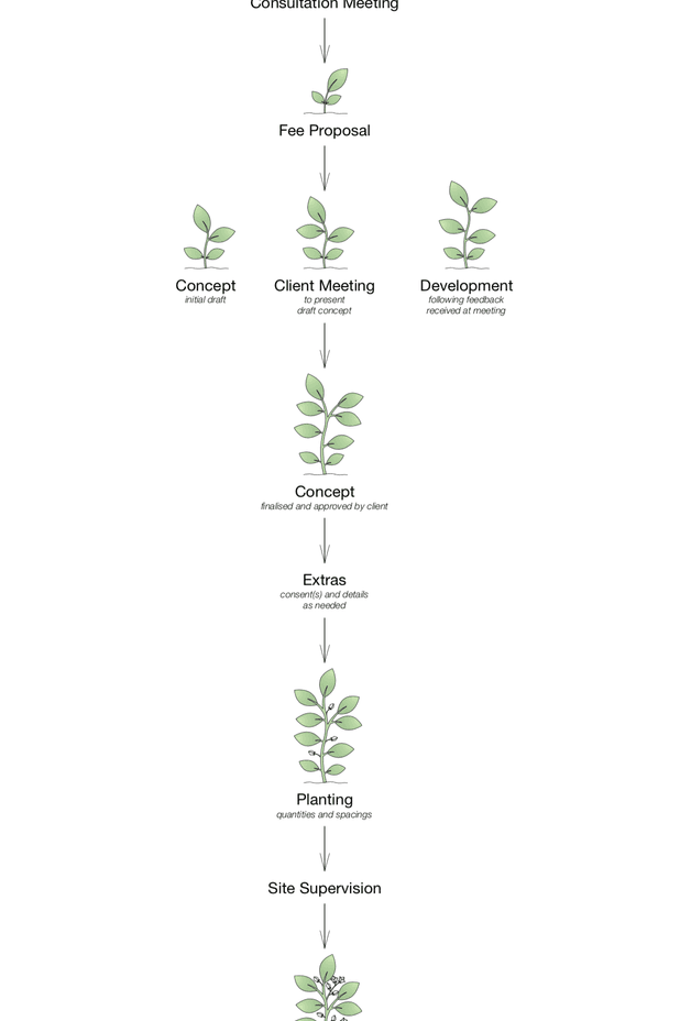 Our first job is to complete a site measure and a site analysis. Along with the measuring, we will look at soils, sunshine, site levels and features. When we feel we understand the site we begin our concept sketch design. This conceptual sketch contains our raw thinking and a design that is workable in reality but not yet formed as detail. We like to present this to you at an early stage so that we can check in with you and get feedback and adjust the concept as necessary.