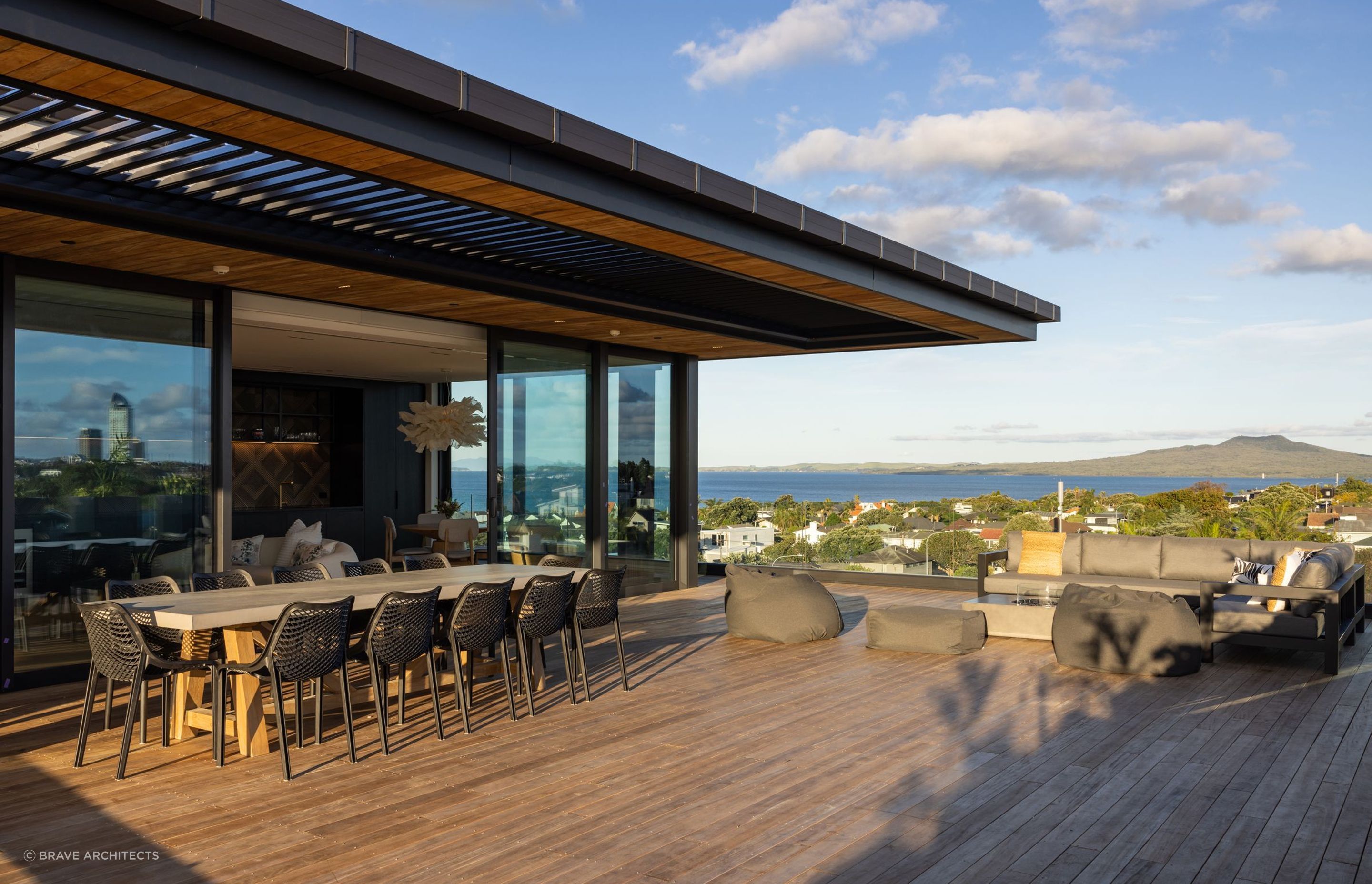 An entertainer’s dream, decking also extends from a second informal living space where a bar area impresses with its open shelving and woven-tiled splashback.