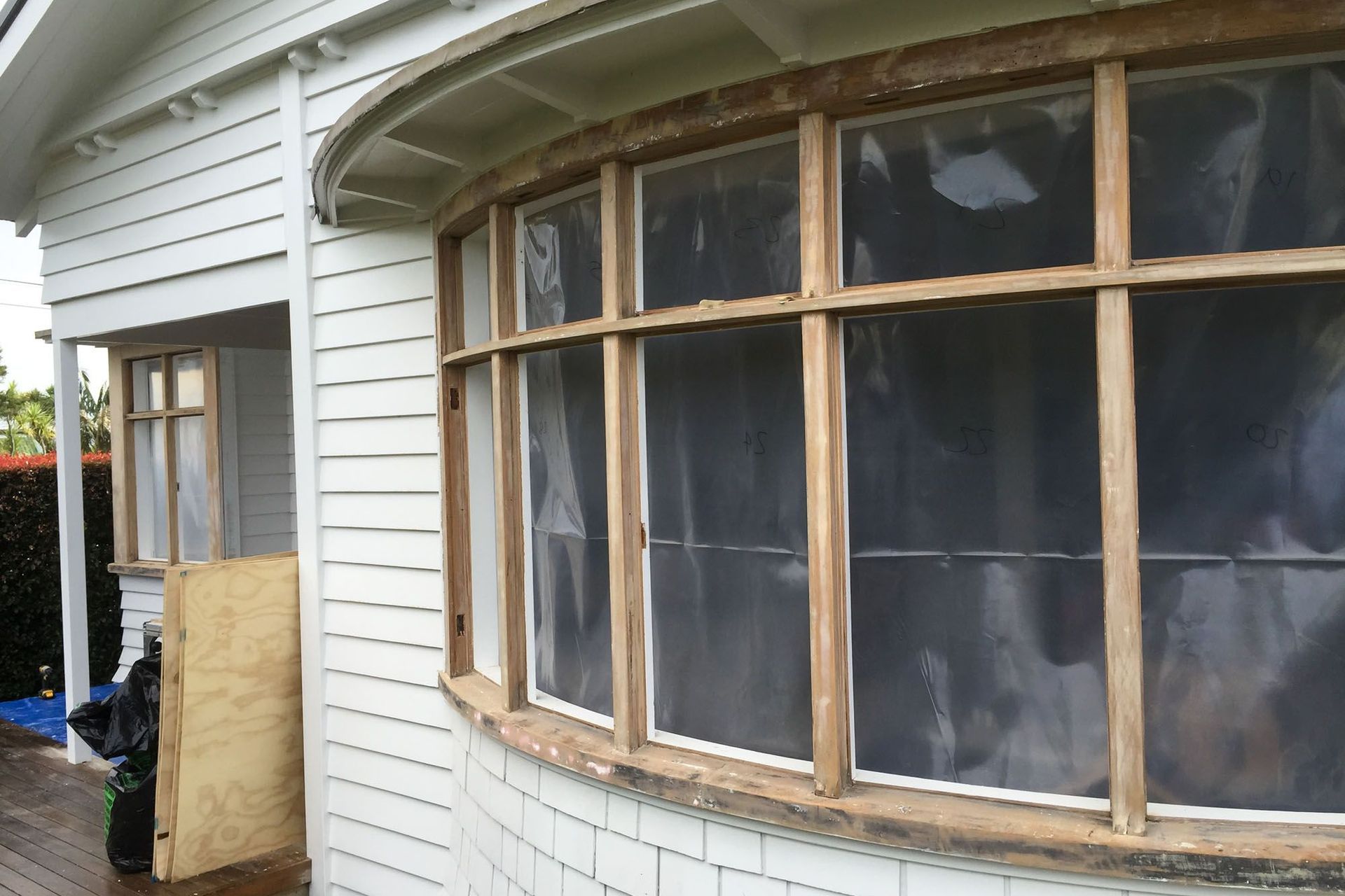 Recently, we completed a project to refurbish some timber windows, including changing fixed sashes into awning hung sashes, and retaining the existing decorative glass. Here, refurbishment was the preferred option. The windows were in total disrepair. The paint, hinges and glazing putty had all gone. But the timber frame was still fine with no rot. The Kauri and Rimu timber was still hard, very dry and took a nice shaving after many decades of exposure. The glass was beautiful, with a deep profile, much like crystal, and the sun light dancing through it was really spectacular.