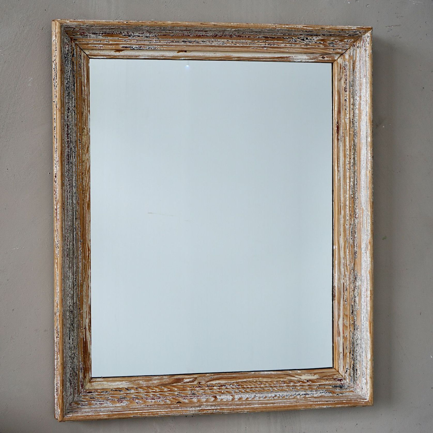 An antique French mirror with wide frame, its original paint showing fantastic worn patina. Can be hung portrait or landscape format.