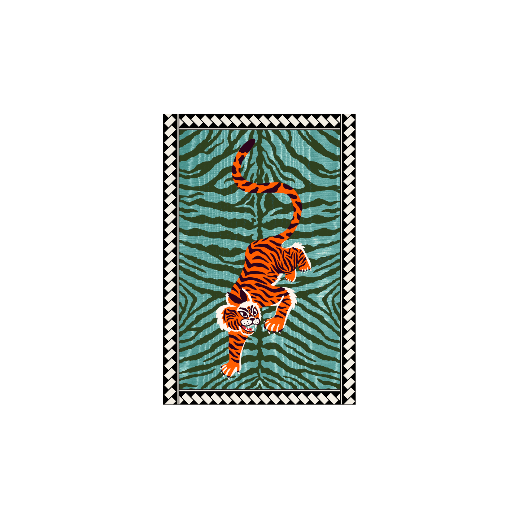 This modern twist on traditional Eastern rug design illustrates a tiger among its own stripes in vibrant colour.