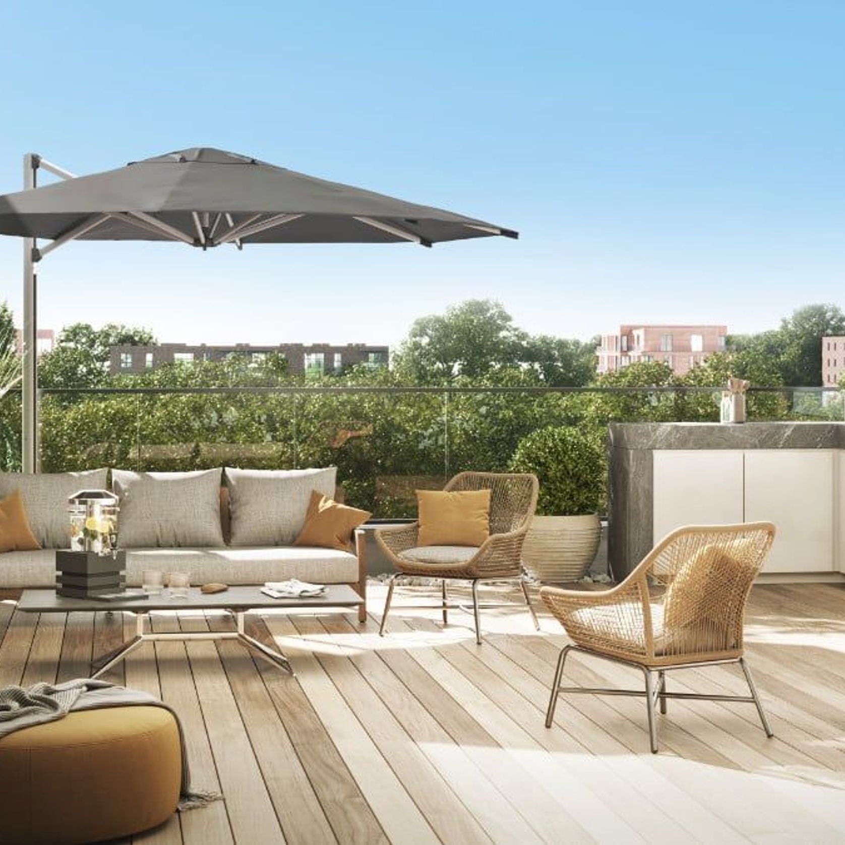 Our collections cover furniture as well as outdoor sun umbrellas and shade solutions, accessories like outdoor cushions, infrared heaters for the patio and beautiful outdoor fire pits and fires that burn biofuel so they can be used indoors too.