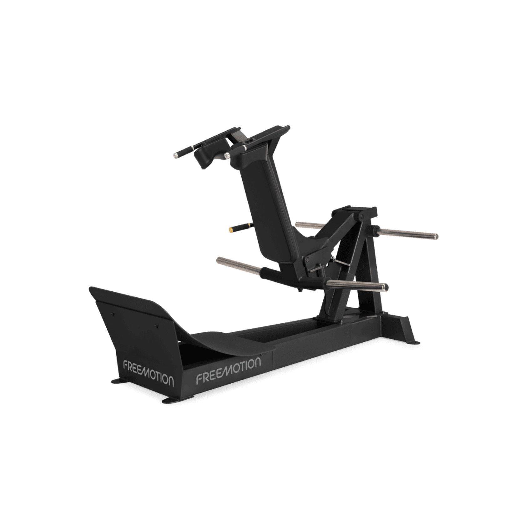 The Freemotion Plate-Loaded Squat helps to encourage proper form through a smooth range of motion with its curved platform. Integrated weight plate storage makes transitioning heavy loads easier and keeps the weight room clear of clutter. Users can set the bottom of their range of motion with the safety stop lever.