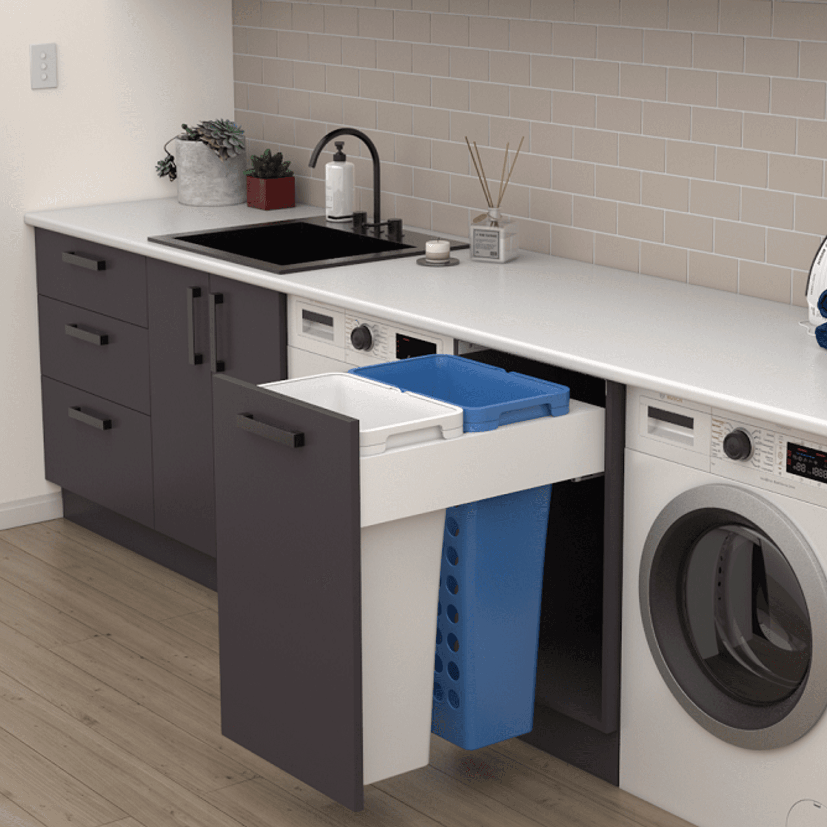 Our pull-out kitchen rubbish bins are hygienic and easy to clean, with most models having a top mounted cover that acts as an odour-minimiser when unit is closed. Multiple bin/basket configurations offer excellent solutions for sorting/storing recyclables and organic kitchen waste or, in the laundry, for pre-sorting loads before washing.