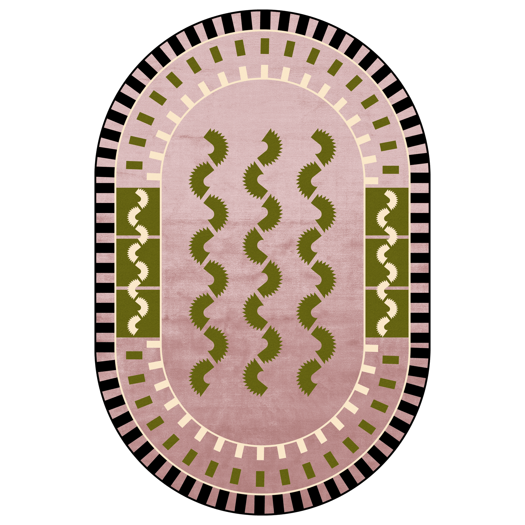 A rug specific design for residential settings, this geometric oval shape piece features an elegant serpent motif.