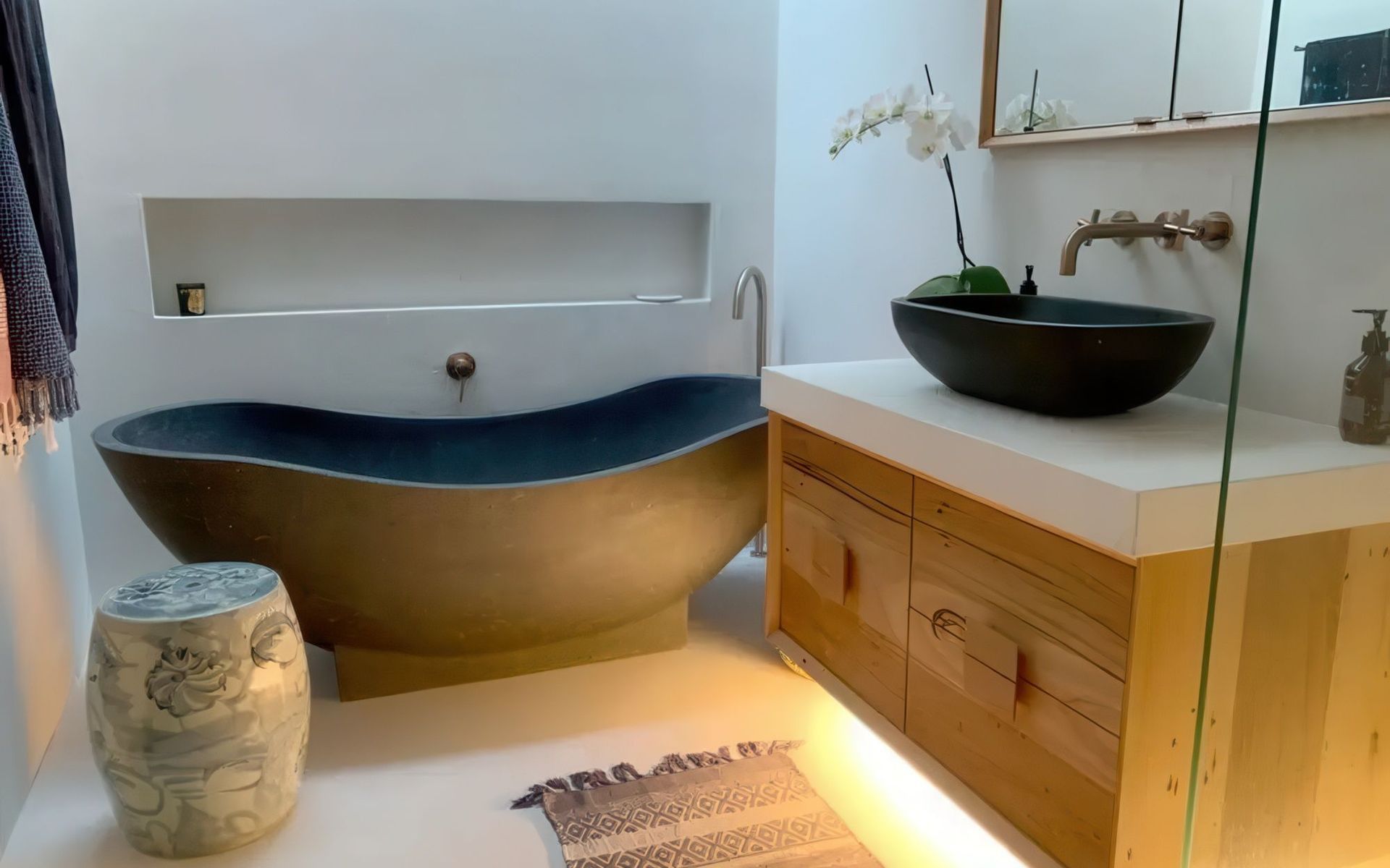 Because our clients have different needs, we use a wide range of materials (stone, stone composite, river stone or megalithic rock, marble, petrified wood, and copper) to create luxury bath furniture. We offer 9 bathtub designs and 18 basin designs declined in hundreds of materials, size, and colour combinations. We work with residential clients, designers, architects, and commercial clients to create custom pieces and suit unique needs.