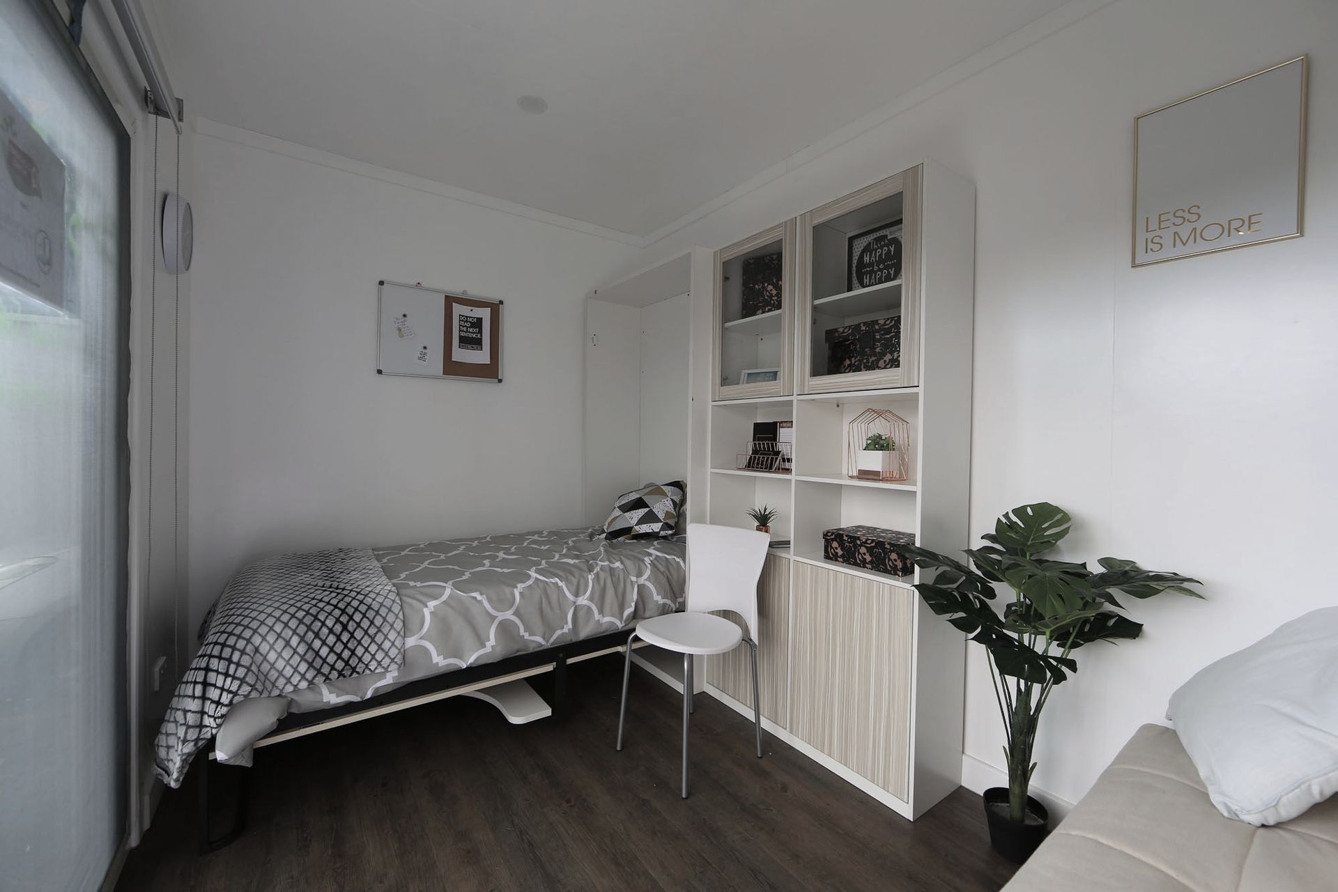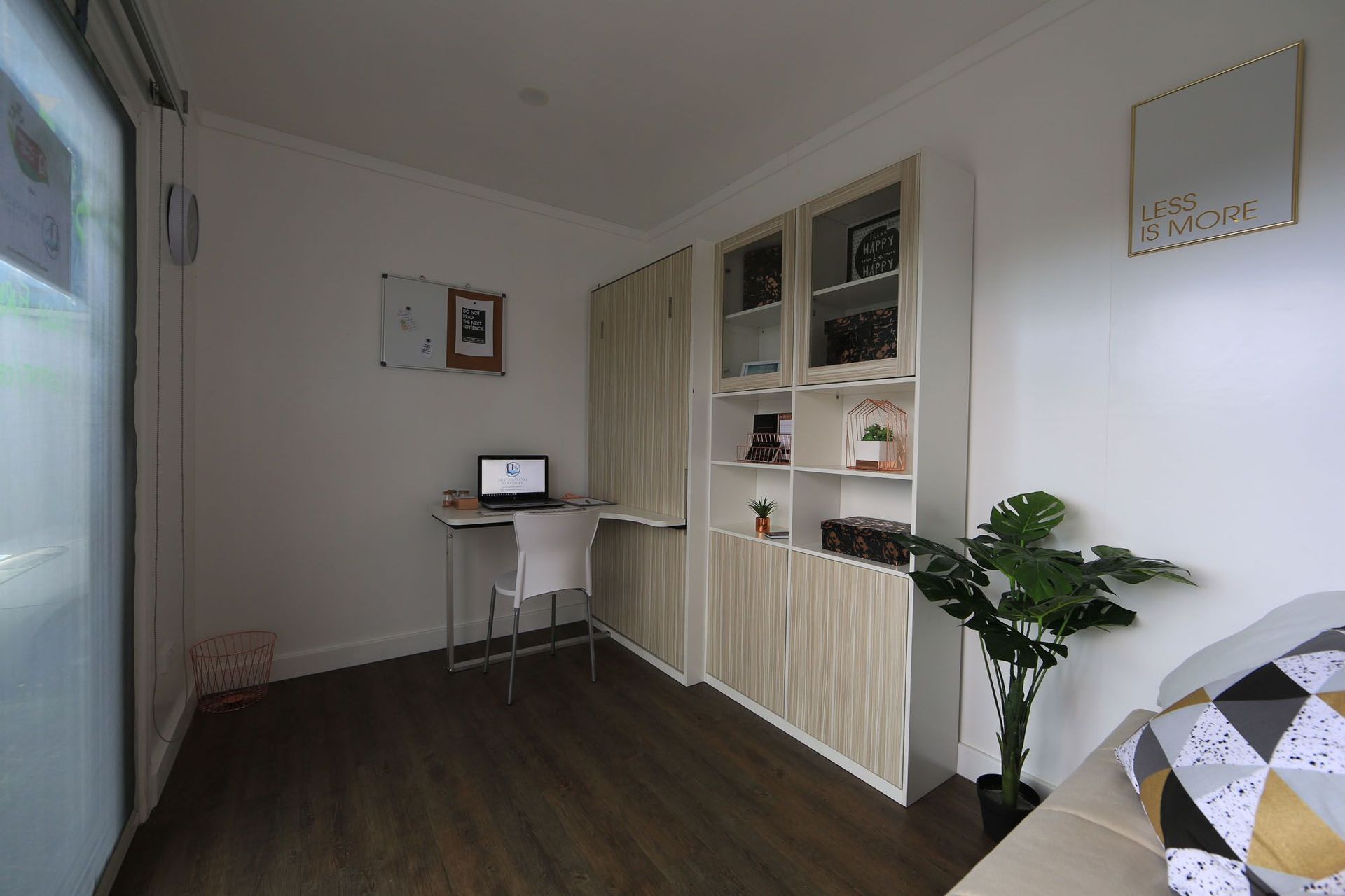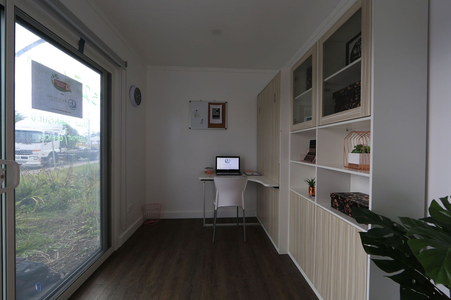 ArchiPro Project Summary - Innovative Container Sleepout in Auckland, featuring custom-sized, fully lined units with dual-purpose furniture, designed for versatility as a guest space or office, completed in 2017 by IQ Container Homes Ltd.