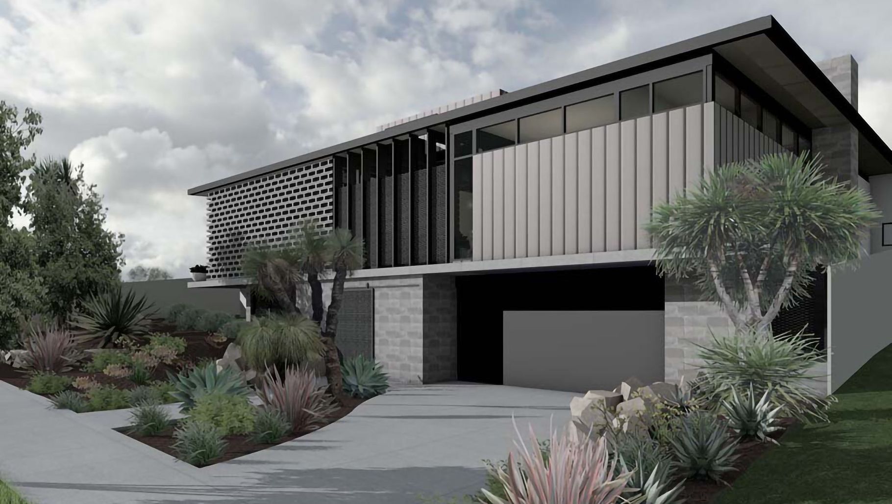 ArchiPro Project Summary - Custom architecturally-designed home on a challenging sloped site, featuring mid-century modern influences, a central courtyard, and sustainable living elements for optimal comfort and privacy.