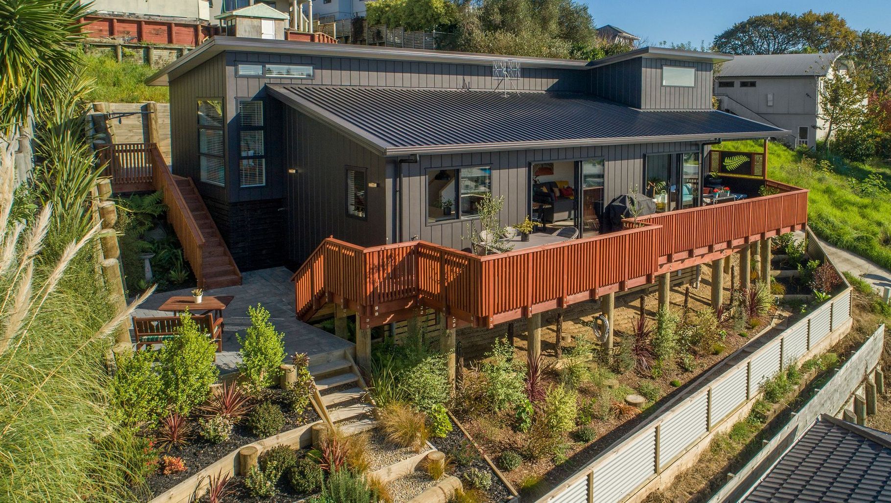 ArchiPro Project Summary - A stunning three-bedroom hillside home featuring a bold black exterior, innovative engineering solutions, and expansive outdoor living spaces, all while capturing breathtaking views of the estuary and Mount Maunganui.