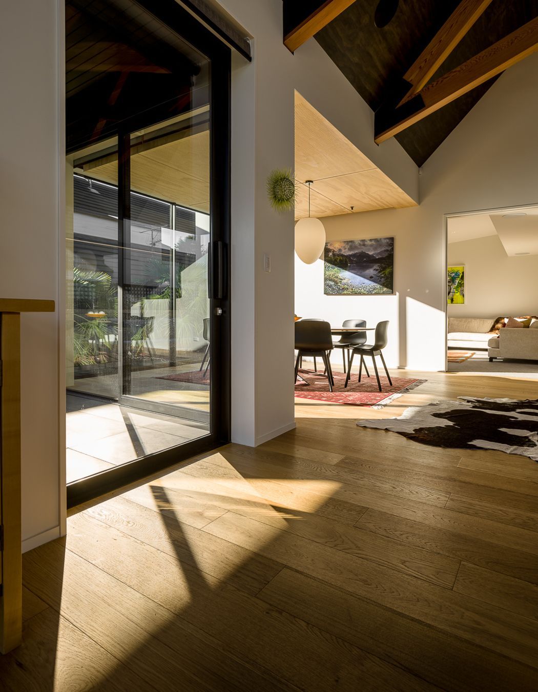 As well as enjoying simple, symmetrical forms, the clients were also drawn to the central Otago aesthetic that focuses on the widespread use of timber both inside and out, with lofty spaces and exposed internal trusses. A mainly raw material palette has been chosen for the home, including the use of stone, timber and steel, similar to many buildings that you might see in the lower South Island.