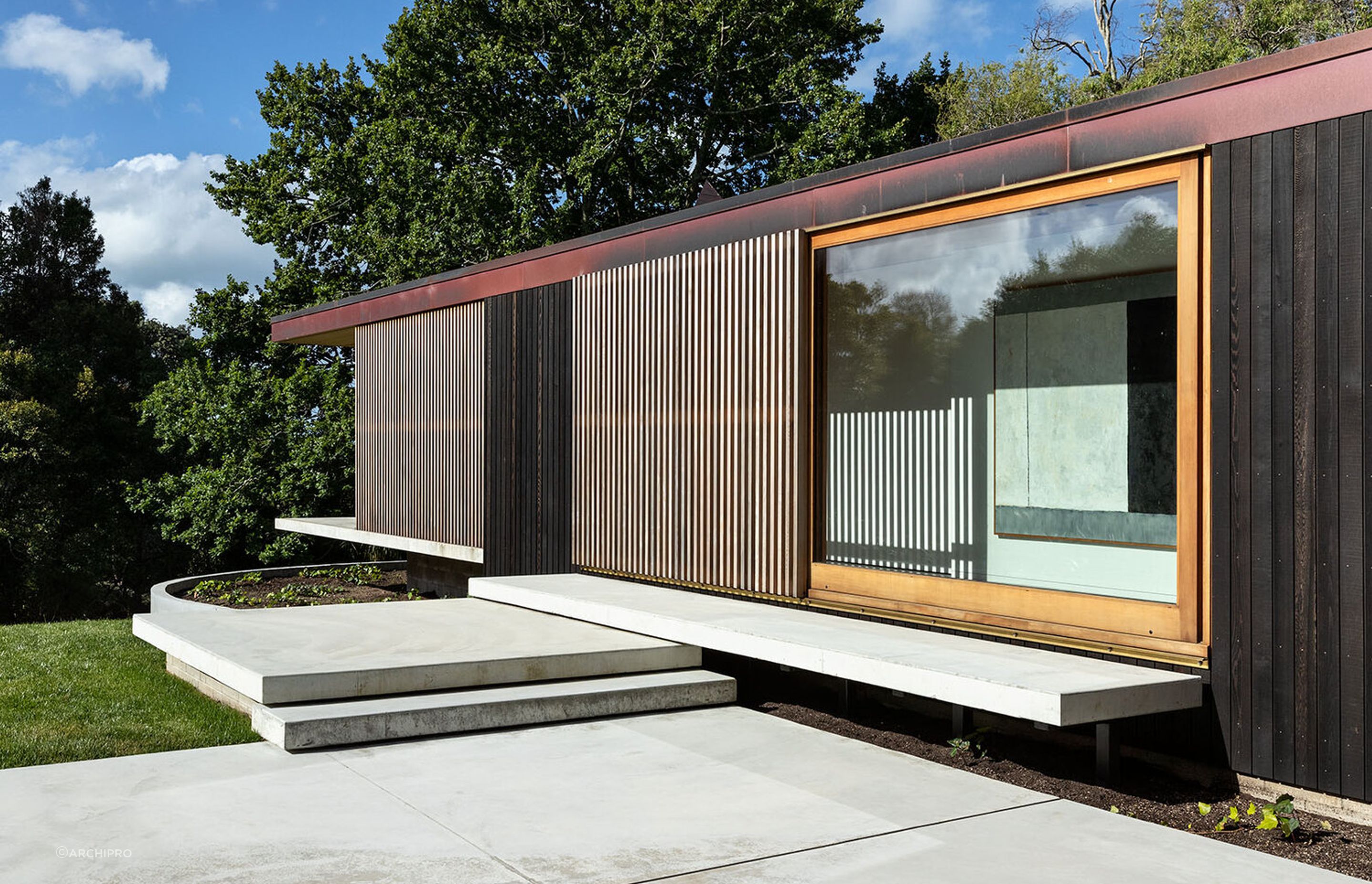 From the exterior, the two pavilions create an interplay of form; one wrapped in zinc and horizontal cedar, the other in copper and vertical cedar in a clear yet seamless delineation. The northern facade is defined by the transition of the operable timber shutters, a dramatic movement of form as the nine shutters across three levels offer myriad possibilities of configuration.