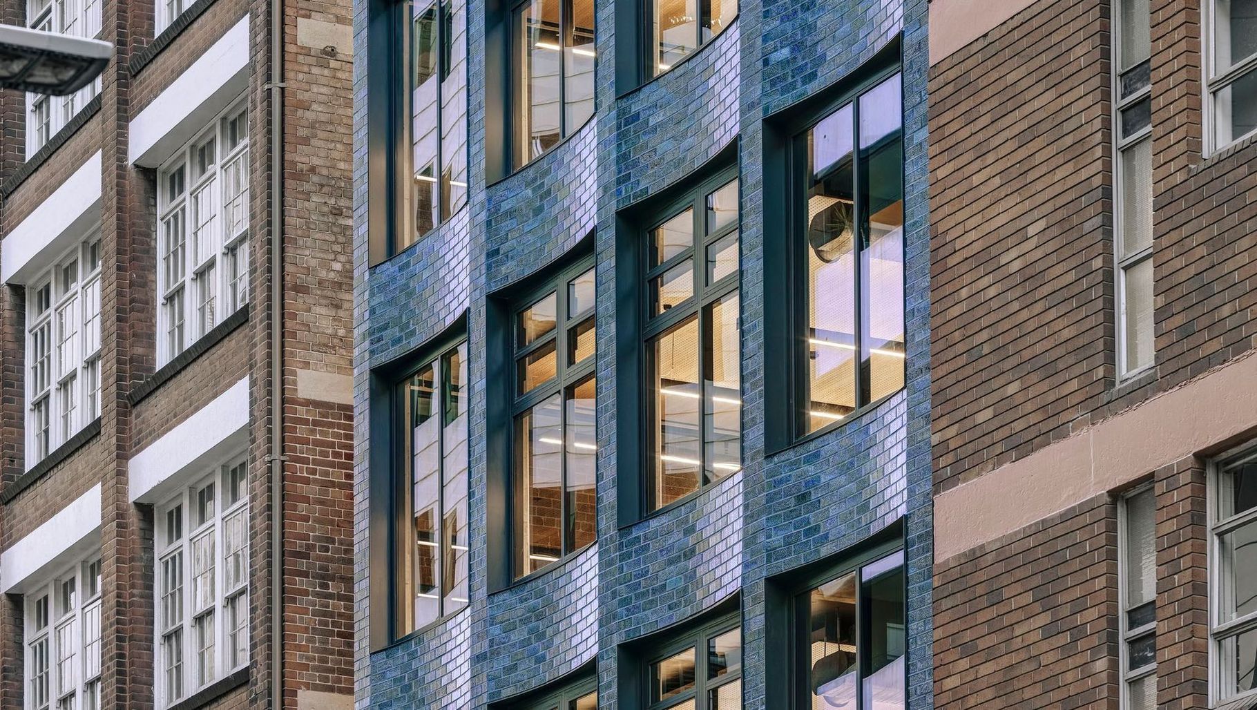 Vibrant blue San Selmo custom glazed bricks have been cut and installed via a fixing rail system. Behind the bright brick facade, gently curved concrete upstands have been cast insitu between continuous concrete columns, which run vertically uninterrupted. The building adheres to a rigorous structural grid of 3.6 x 2.4 metres, to which all columns and window openings have been aligned. A spine of precast concrete along the eastern side of the floorplate provides structural stability and contains all service risers, fire stairs and amenities, leaving the rest of the floorplates entirely column-free.