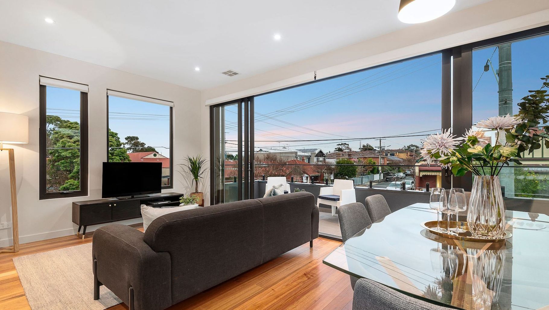 ArchiPro Project Summary - Argyle Street 2 features modern design with hardwood flooring, houseplants, and large windows for a bright, inviting atmosphere.
