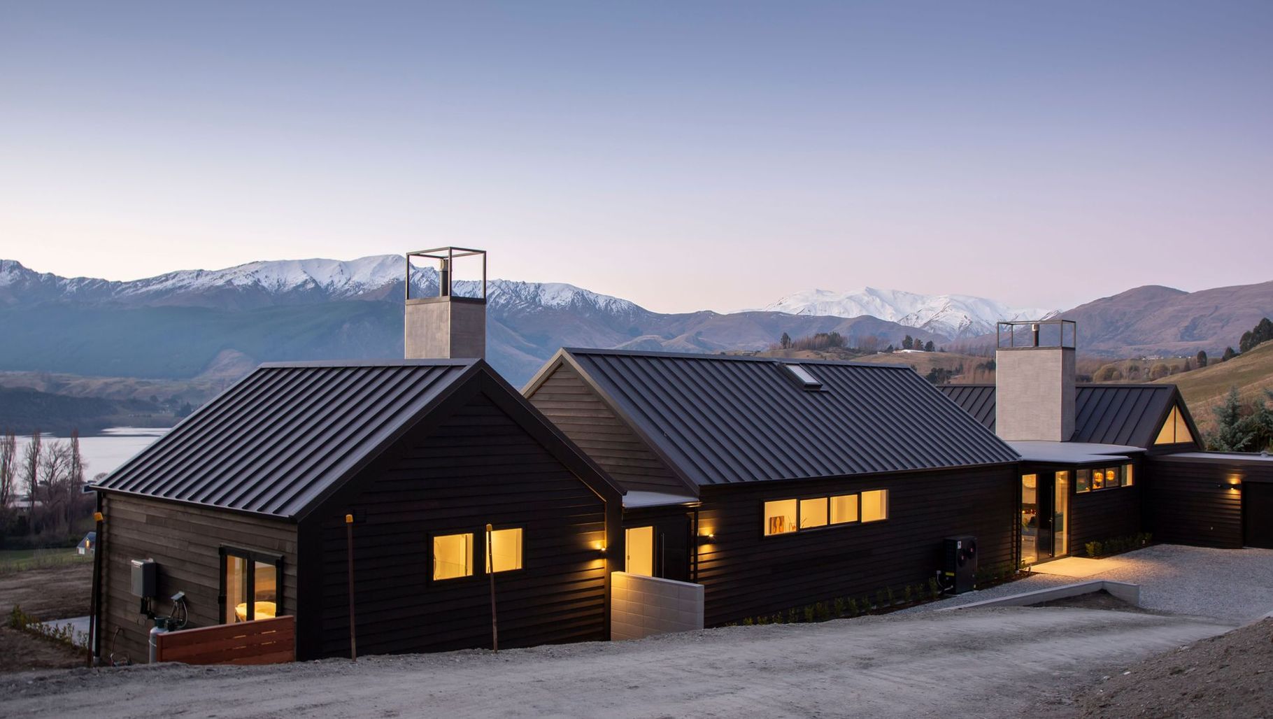 ArchiPro Project Summary - A stunning semi-retirement home in Lake Hayes featuring three gabled pavilions, designed by Martin Hofman and built by David Reid Homes, seamlessly blending with the Central Otago landscape while offering breathtaking views and versatile outdoor living spaces.