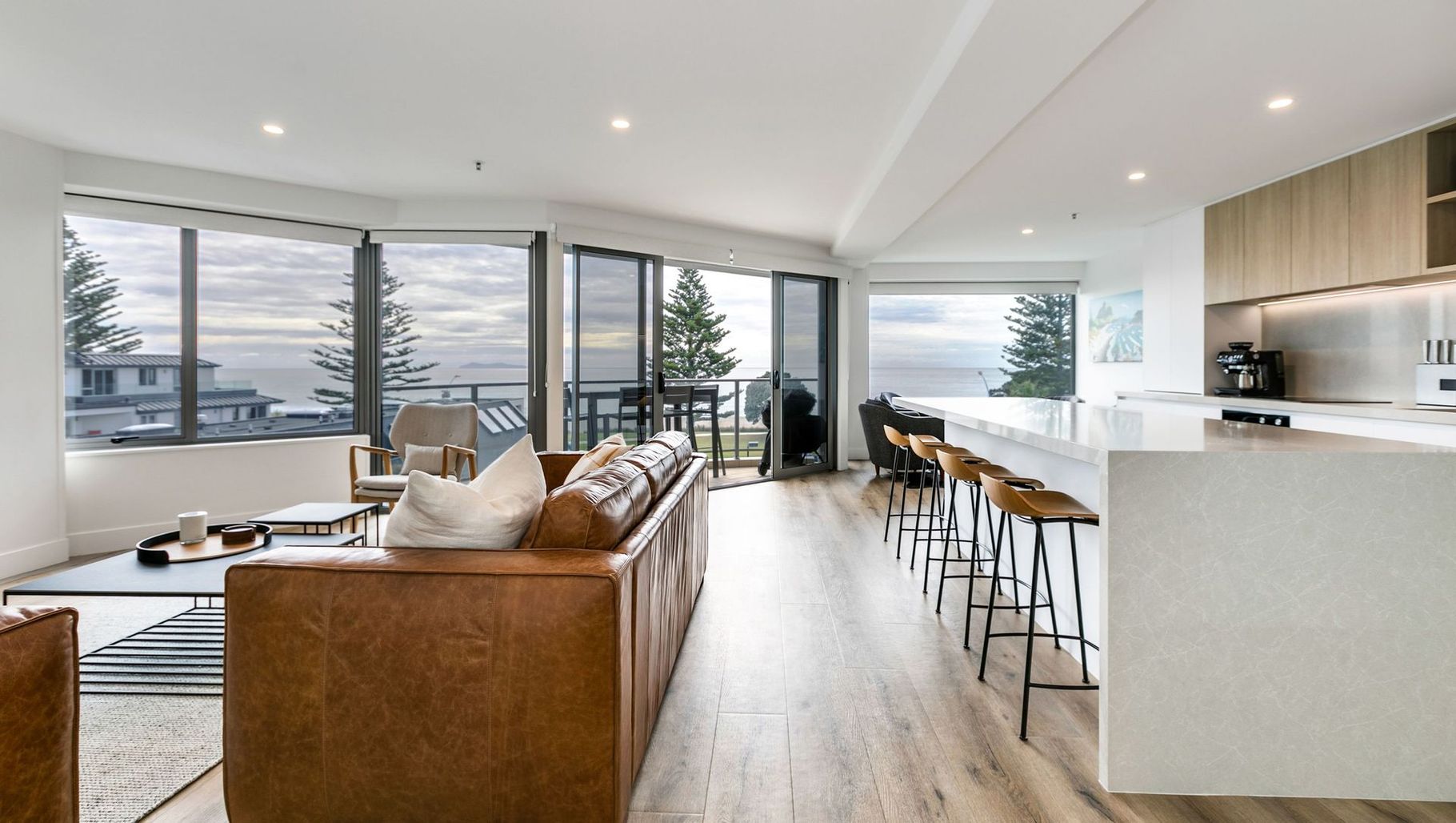 ArchiPro Project Summary - A beautifully renovated apartment on Marine Parade, Mount Maunganui, transforming dated living into a modern oasis that maximizes space, sunlight, and stunning views for a warm and inviting atmosphere.
