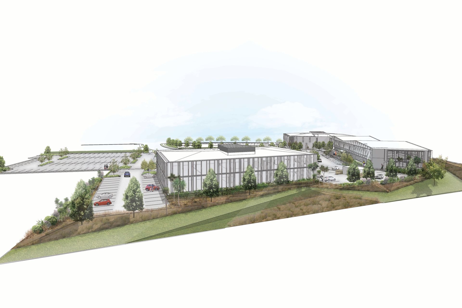 ArchiPro Project Summary - CIAL Agricultural Precinct: A thoughtfully designed office precinct featuring an eye-catching frontage, efficient site layout, and a central pocket park that offers a serene sanctuary for workers amidst the bustling environment of the State Highway and airport entry road.