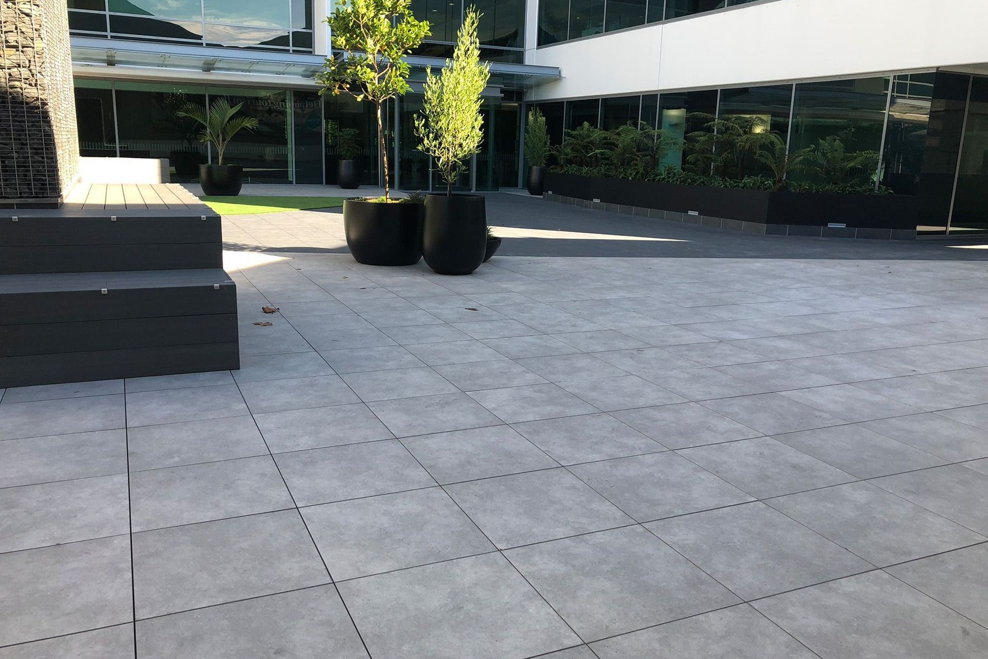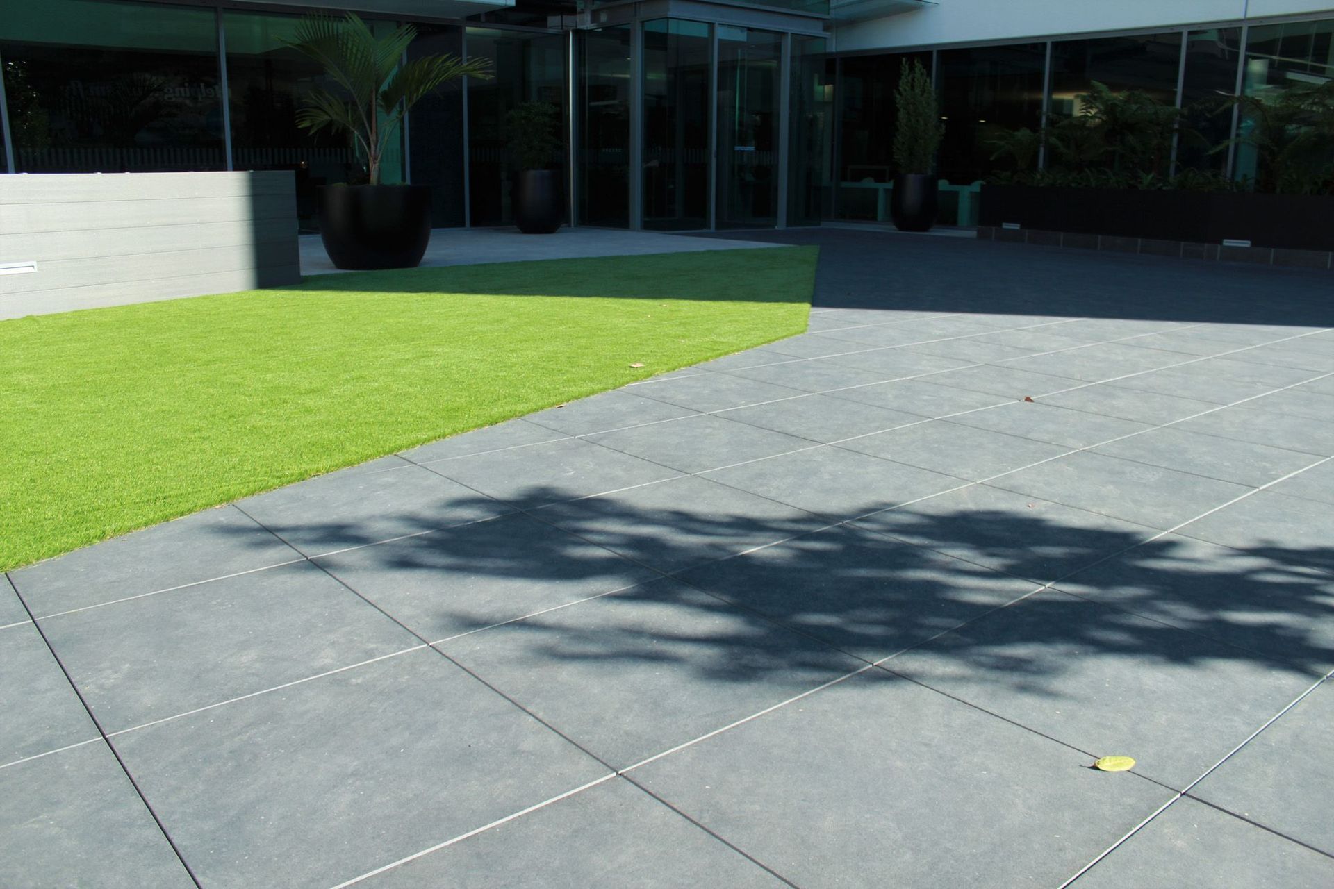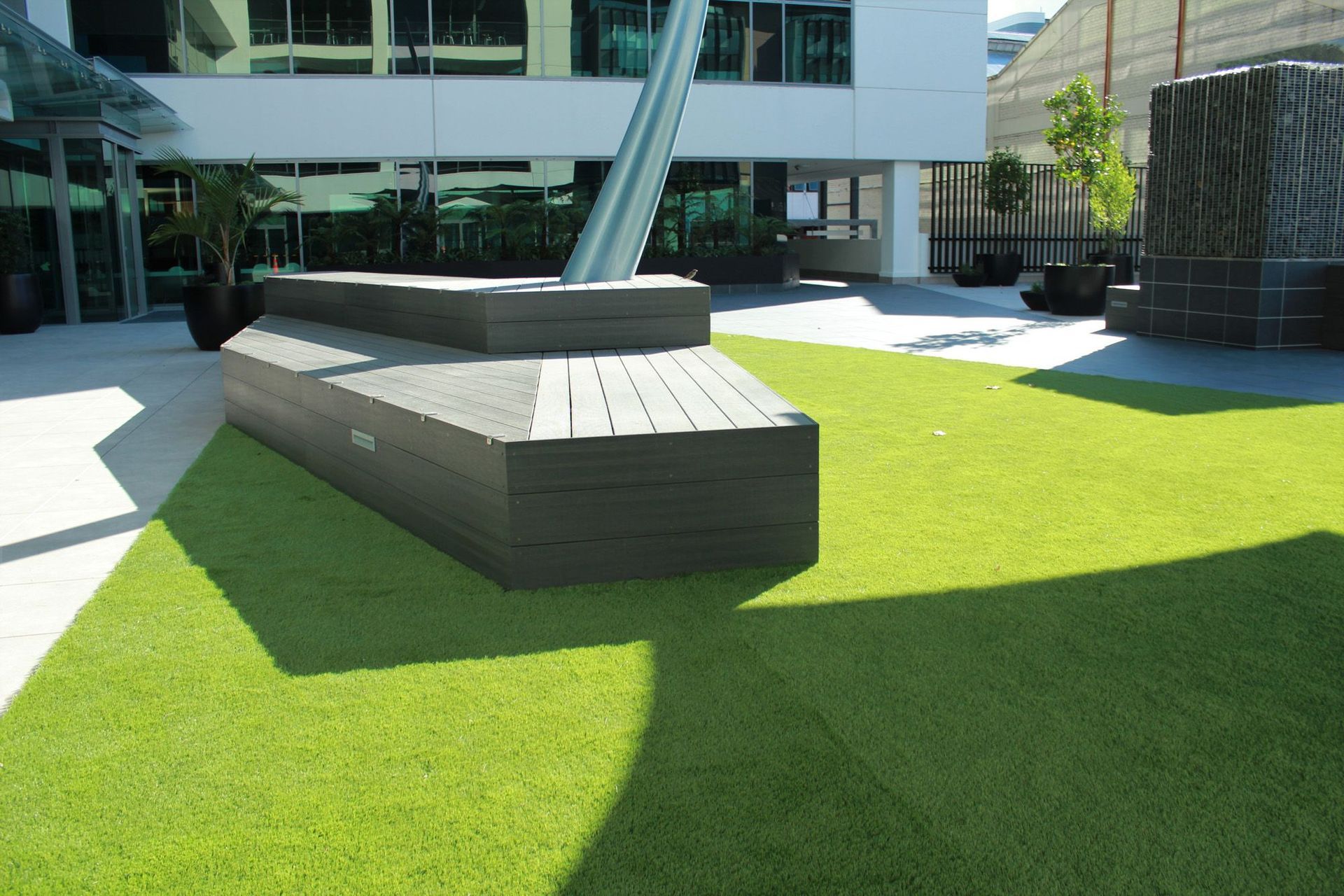 ArchiPro Project Summary - A floating tile deck over a lightweight aluminium frame enhances the Wynyard Quarter plaza, featuring durable, grout-free tiles, synthetic turf, composite timber benches, and industrial screens for a sleek, high-traffic commercial space.
