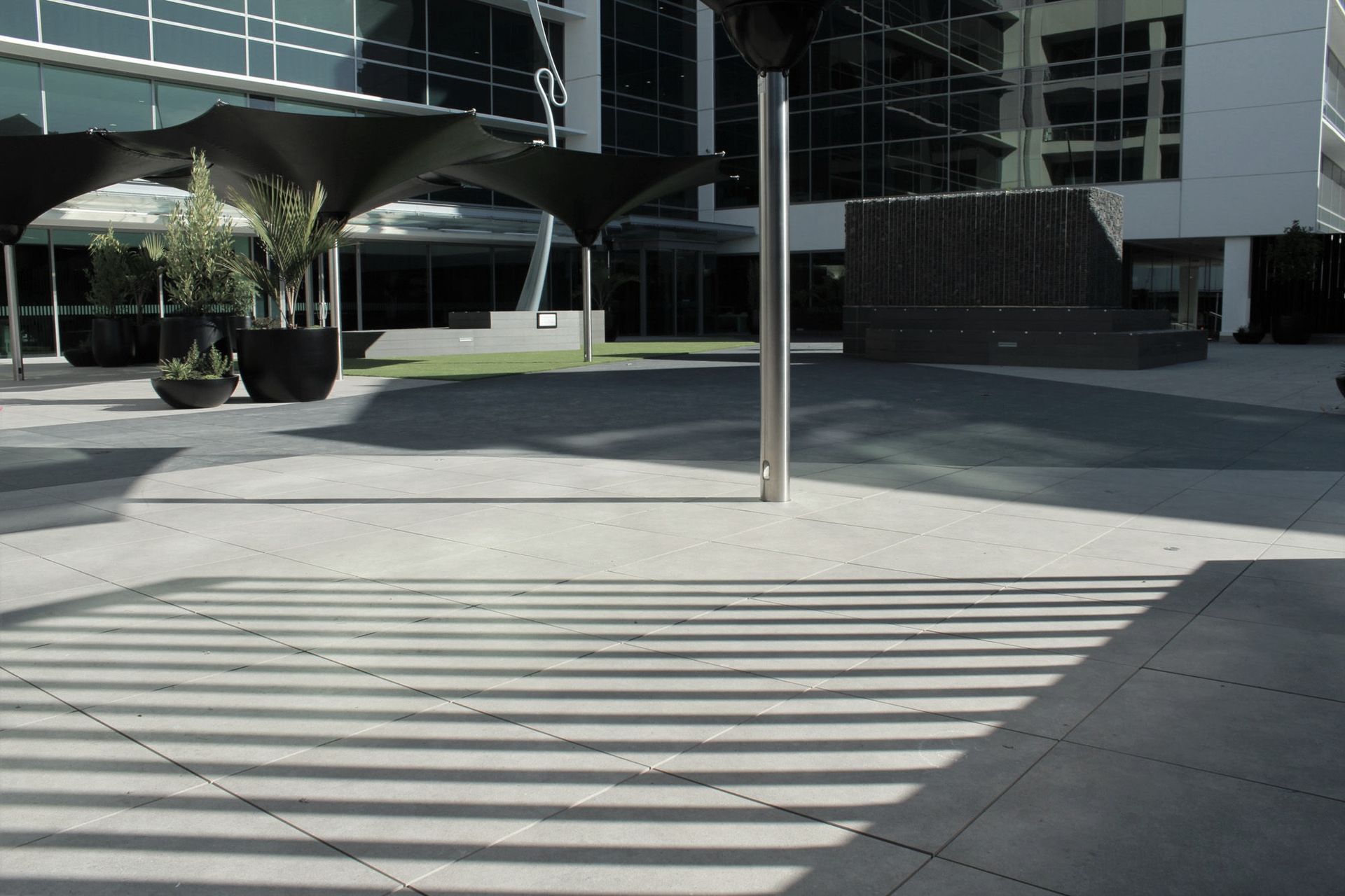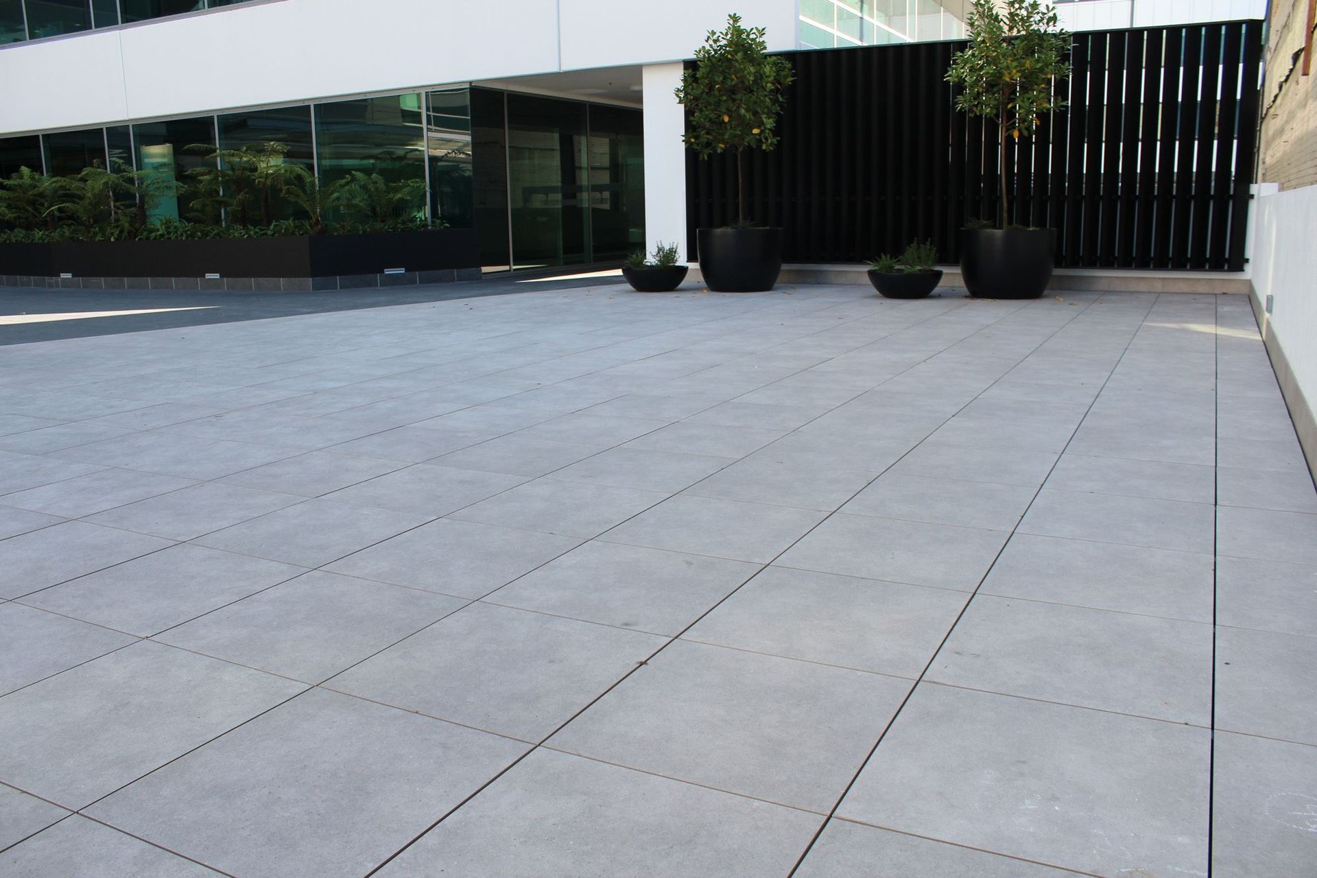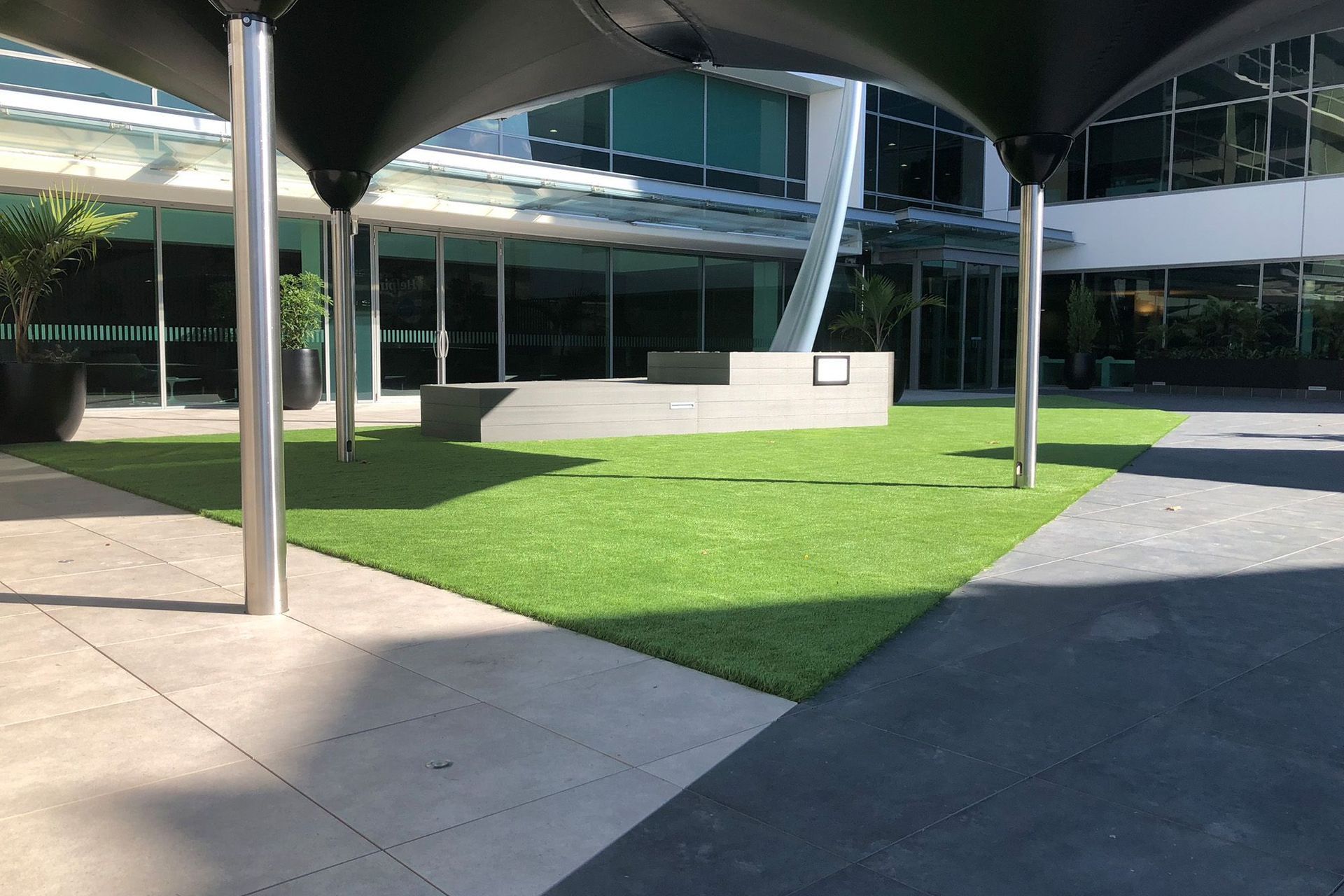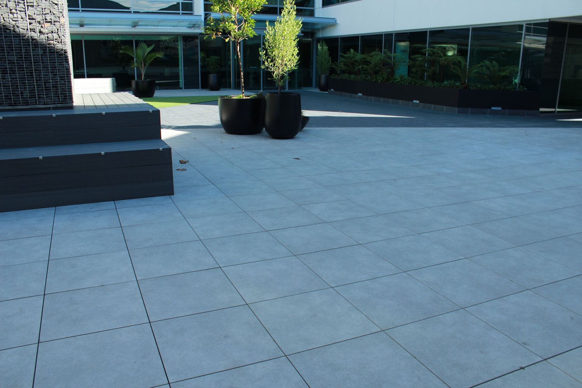 ArchiPro Project Summary - A floating tile deck over a lightweight aluminium frame enhances the Wynyard Quarter plaza, featuring durable, grout-free tiles, synthetic turf, composite timber benches, and industrial screens for a sleek, high-traffic commercial space.