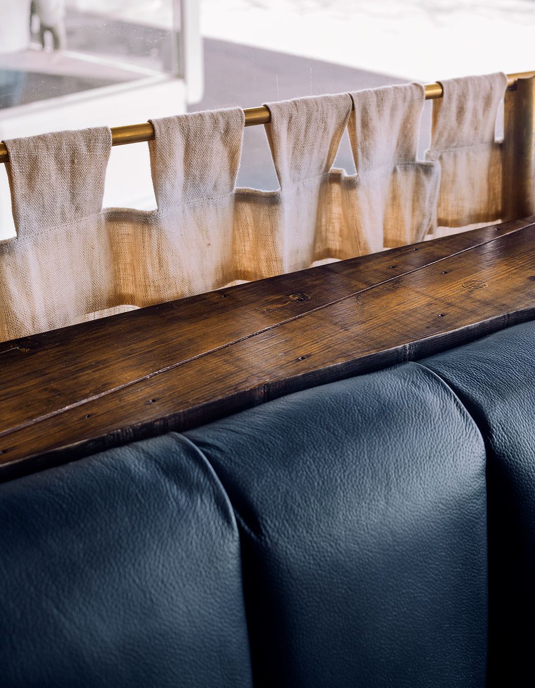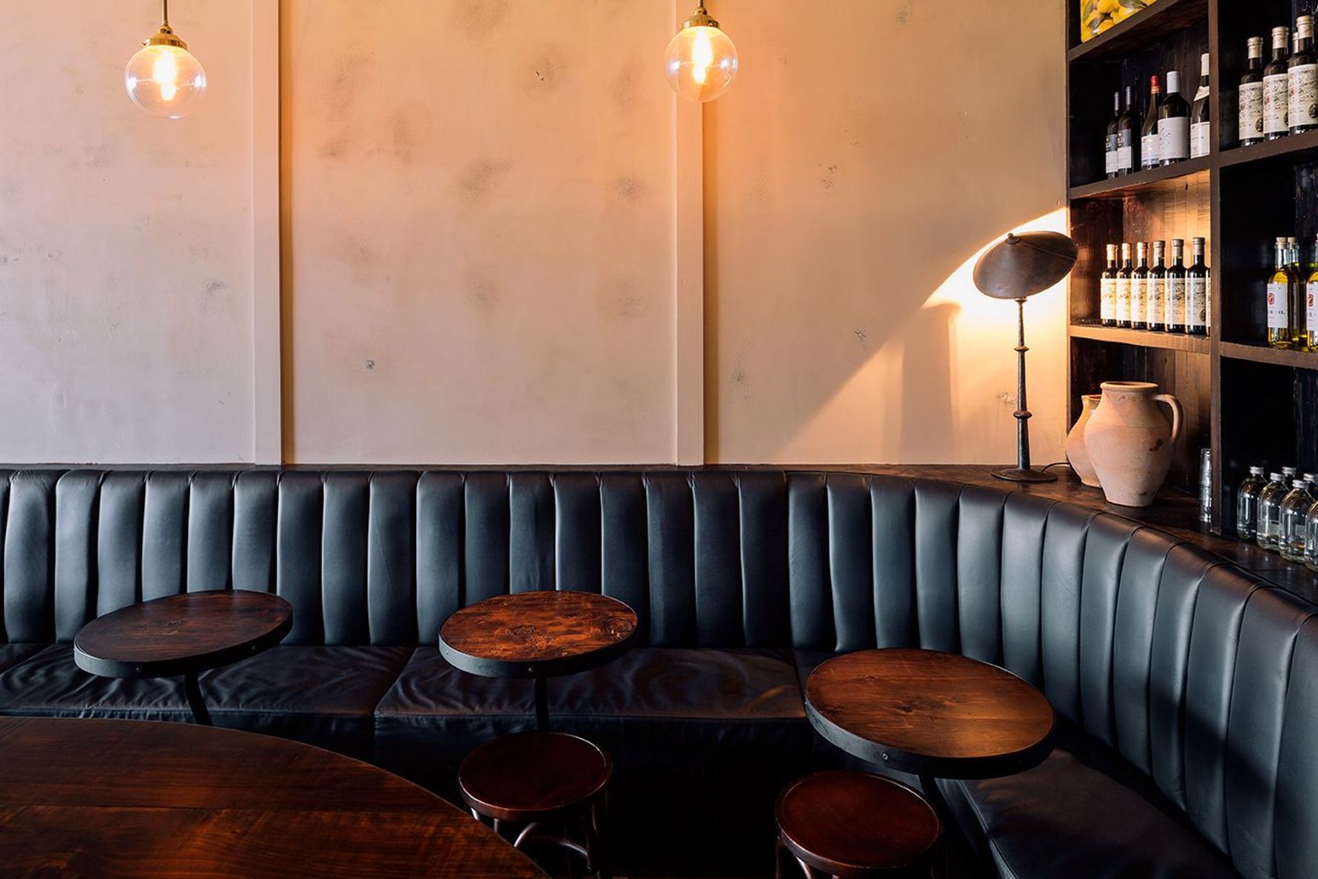 ArchiPro Project Summary - Elegant wine bar in Ponsonby featuring a handmade walnut veneer bar, brass detailing, and navy blue leather upholstery, designed for both beauty and functionality in a limited seating space.