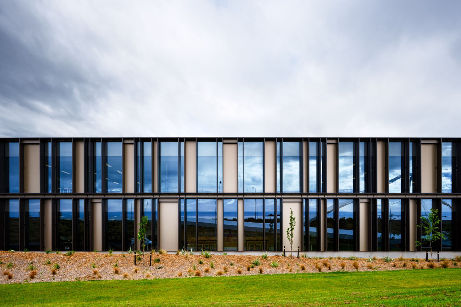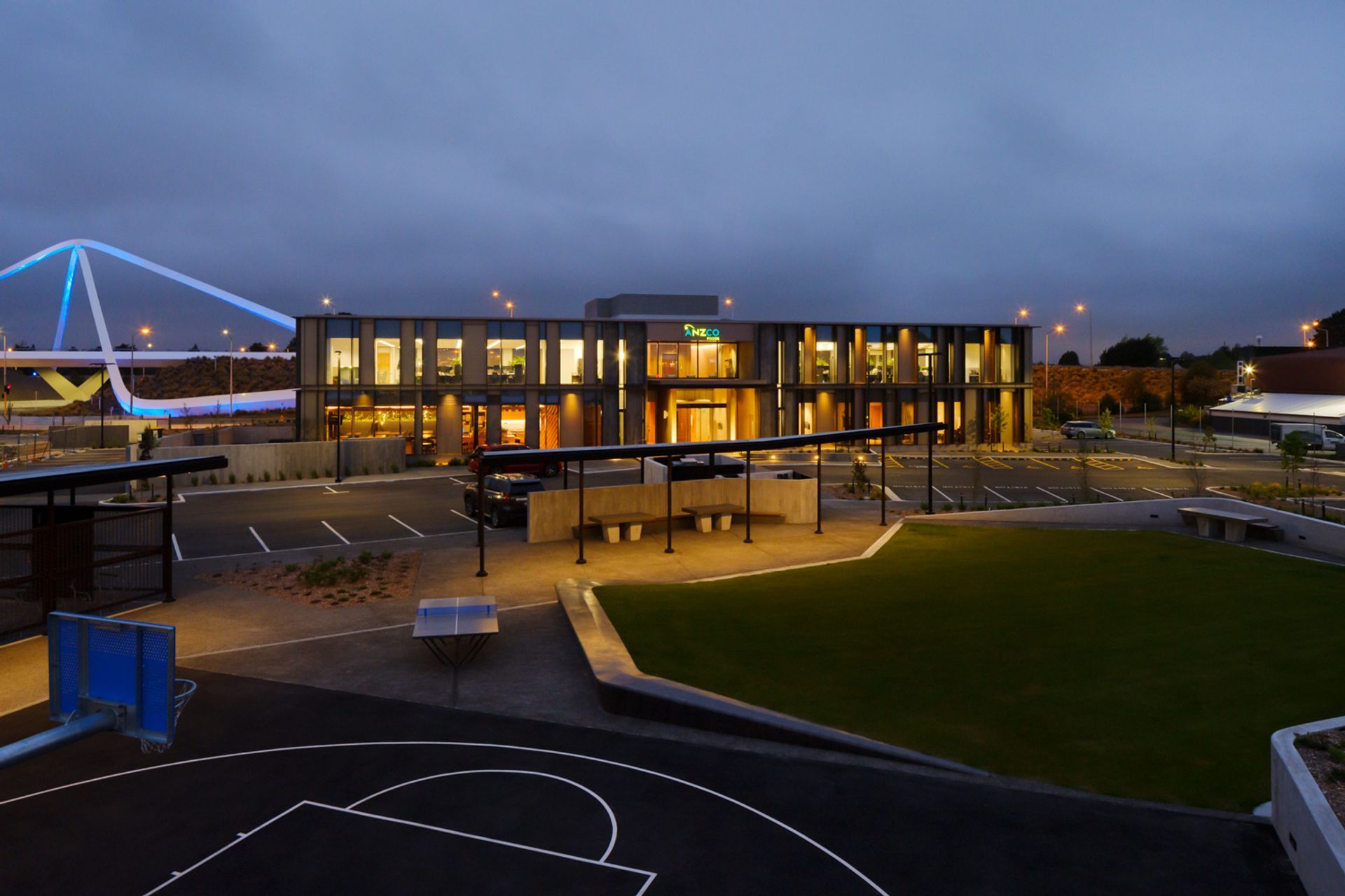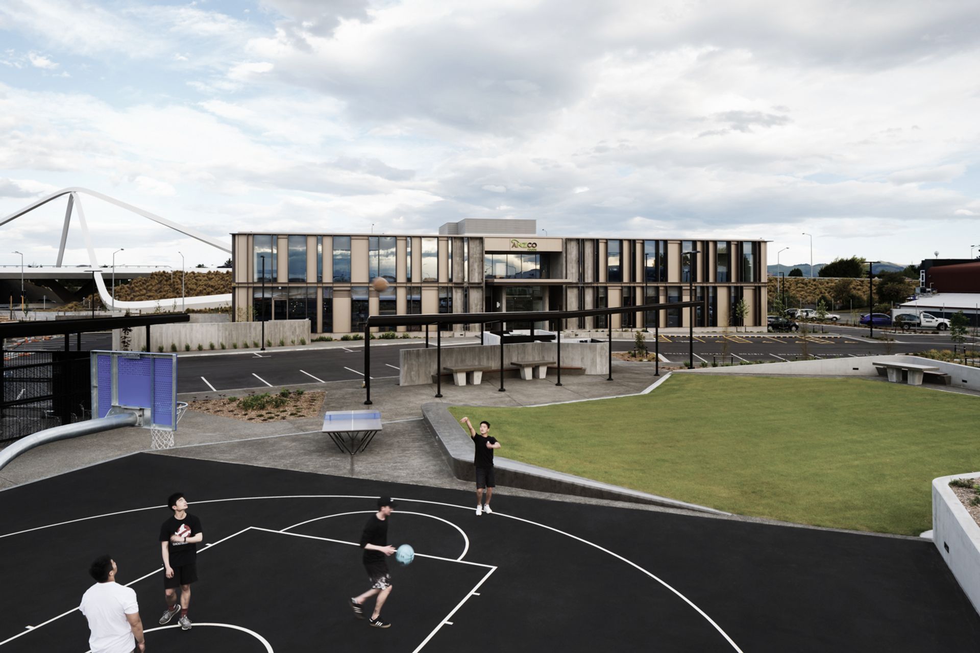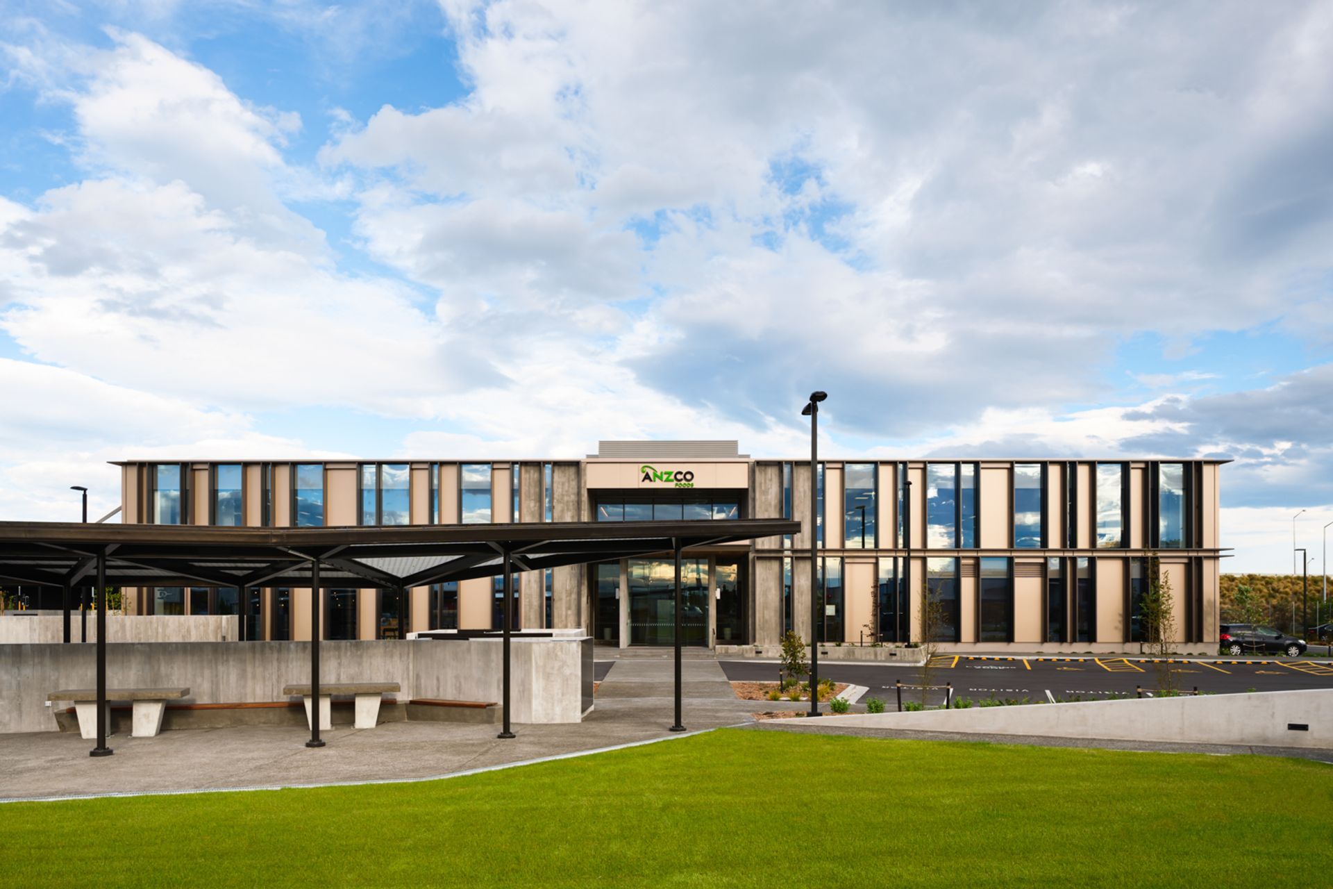 ArchiPro Project Summary - ANZCO Foods Headquarters, strategically located within the CIAL business park, features modern office spaces adjacent to Christchurch International Airport, complemented by staff amenities including car and cycle parking, and recreational facilities.