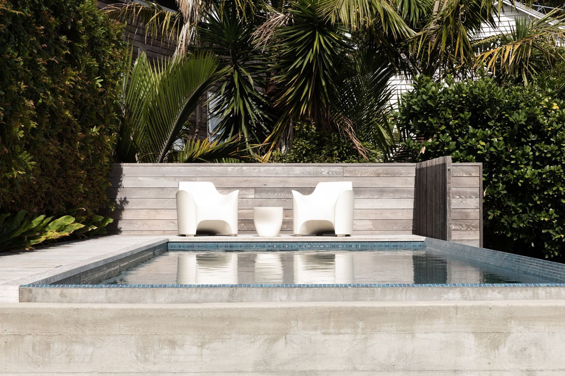 ArchiPro Project Summary - A robust recreation area featuring a creatively elevated pool design, complemented by patterned concrete forms and privacy screens, tailored for a family with four teenage boys.