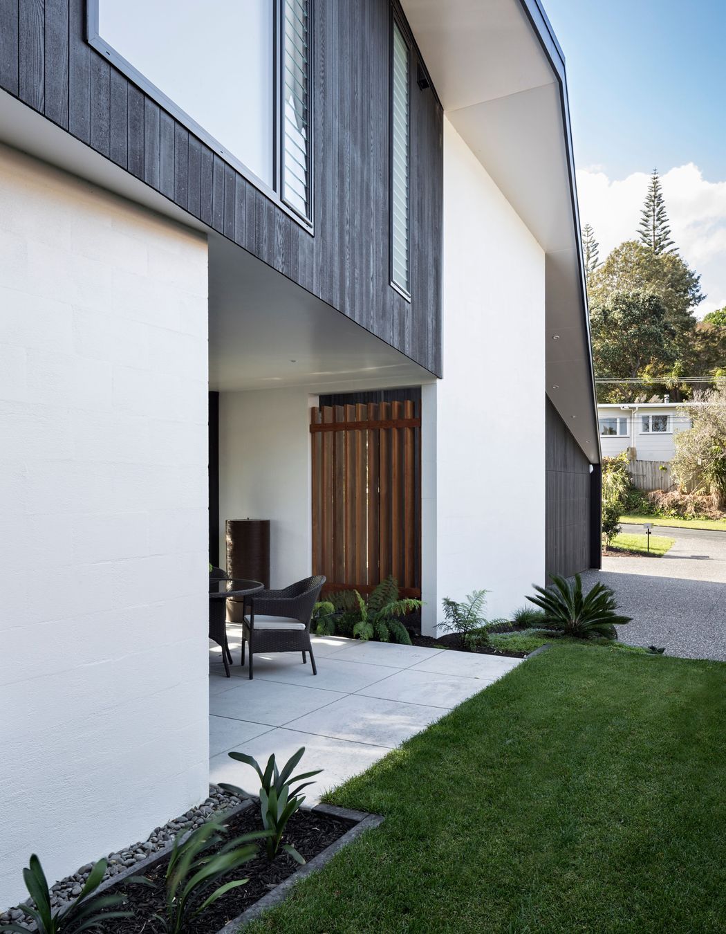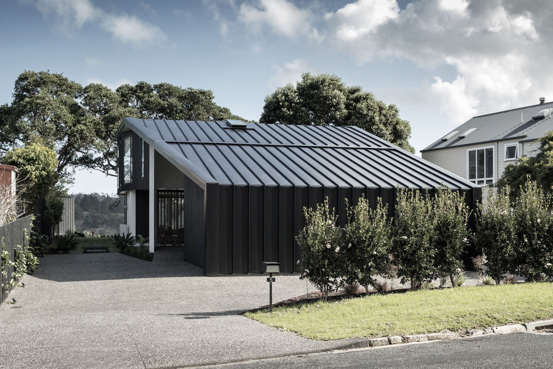 ArchiPro Project Summary - A stunning four-bedroom residence in Whangaparaoa, designed for privacy and breathtaking views of the Wade River and Arkles Bay, featuring a striking angular form, vertical metal cladding, and generous outdoor living spaces.
