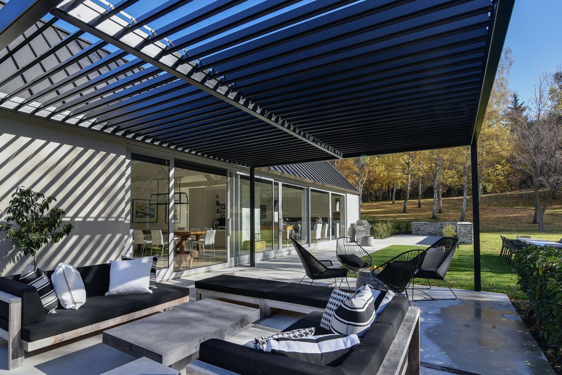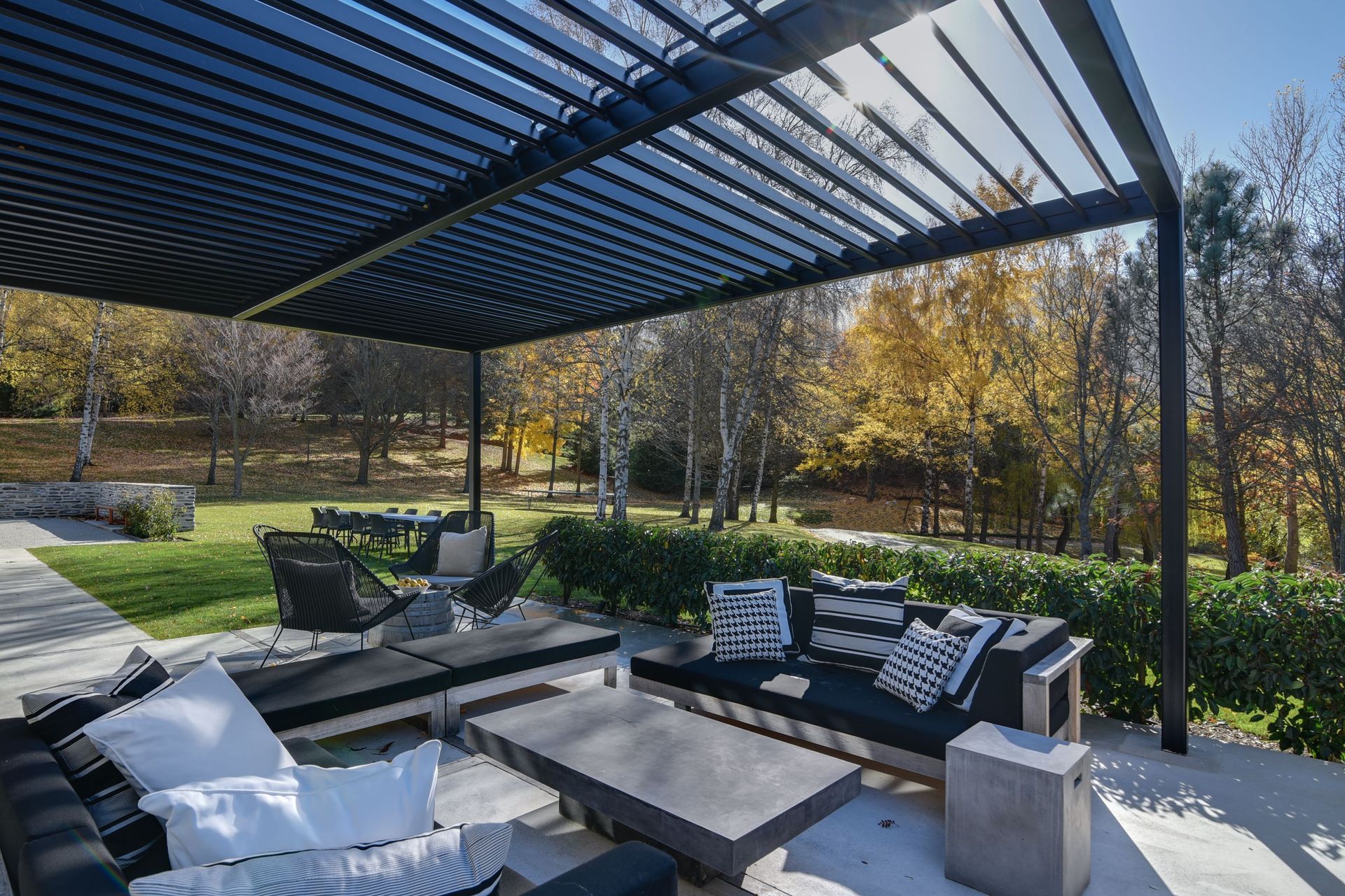 ArchiPro Project Summary - A stunning free-standing louvred pergola featuring a local schist stone fireplace, designed to enhance outdoor living in Arrowtown, while maintaining architectural integrity and warmth for year-round enjoyment.