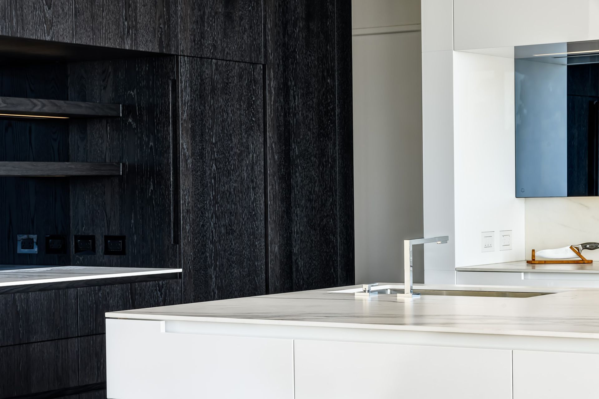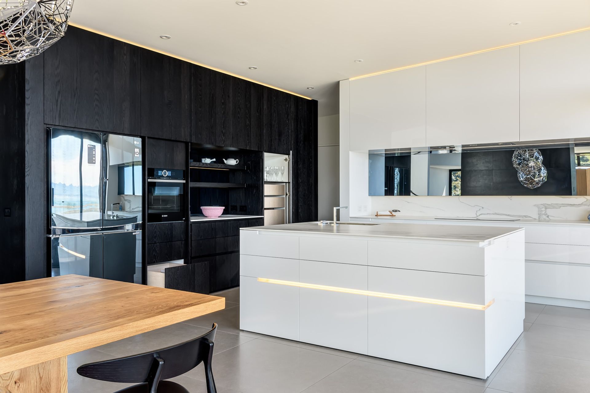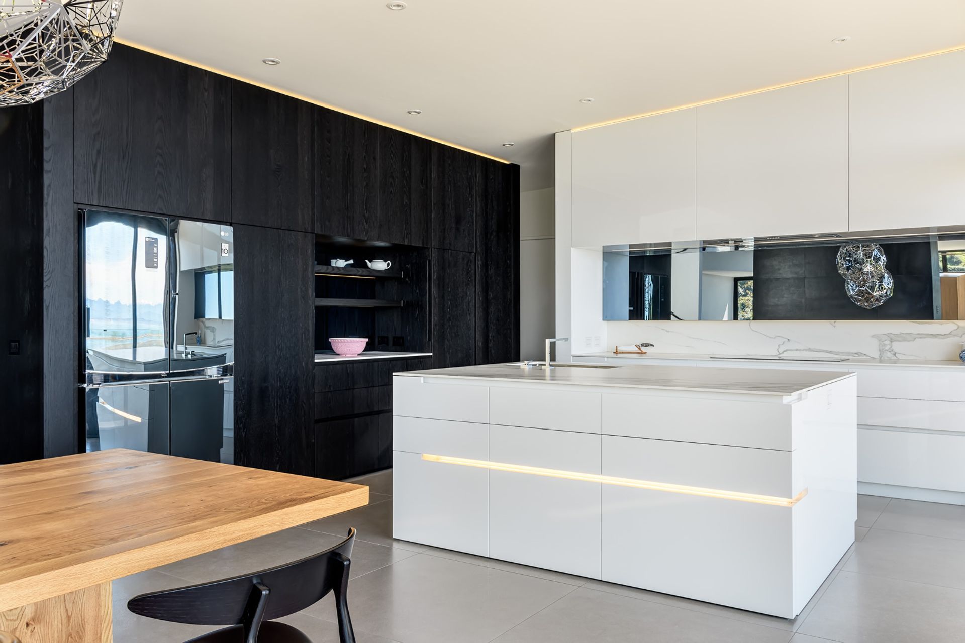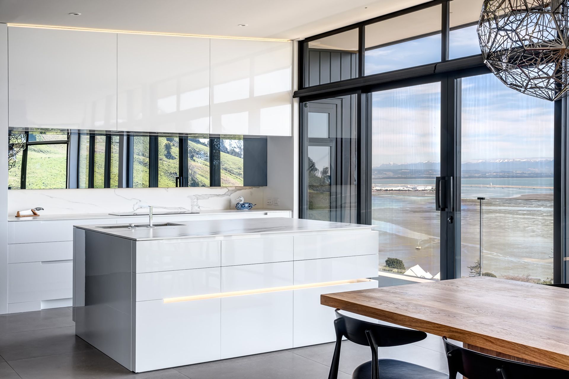 ArchiPro Project Summary - A stunning residence in Atawhai, Nelson, designed by Klaus Todt and Redbox Architects, featuring a custom kitchen and cabinetry that harmoniously blend high gloss and matte finishes, maximizing breathtaking sea views and natural light.