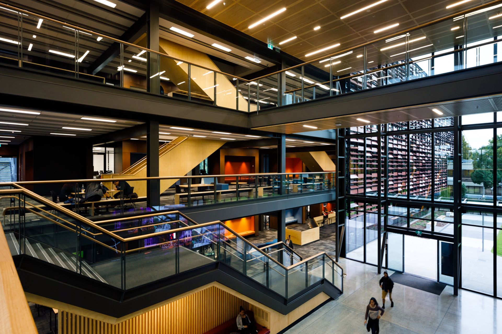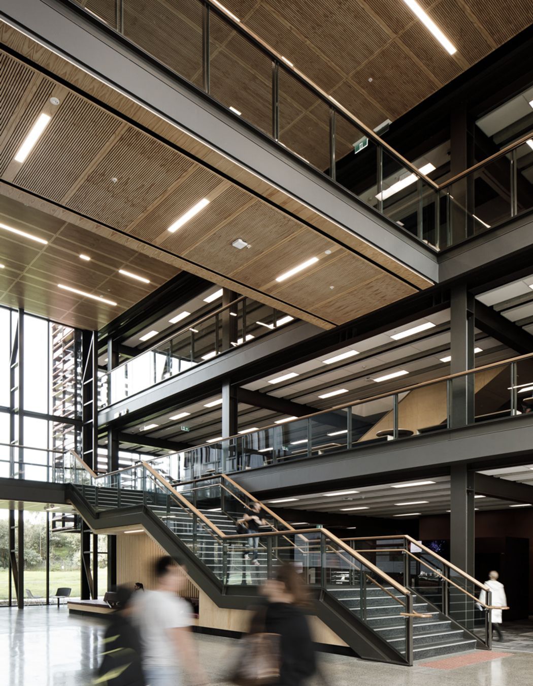 ArchiPro Project Summary - Collaboration between Décortech and Jasmax Architects on the AUT M1 building featuring Décortech Firesafe MDF with Radiata Pine Veneer, custom slot perforation, and a combination of a customized dark stain and clear satin finish.