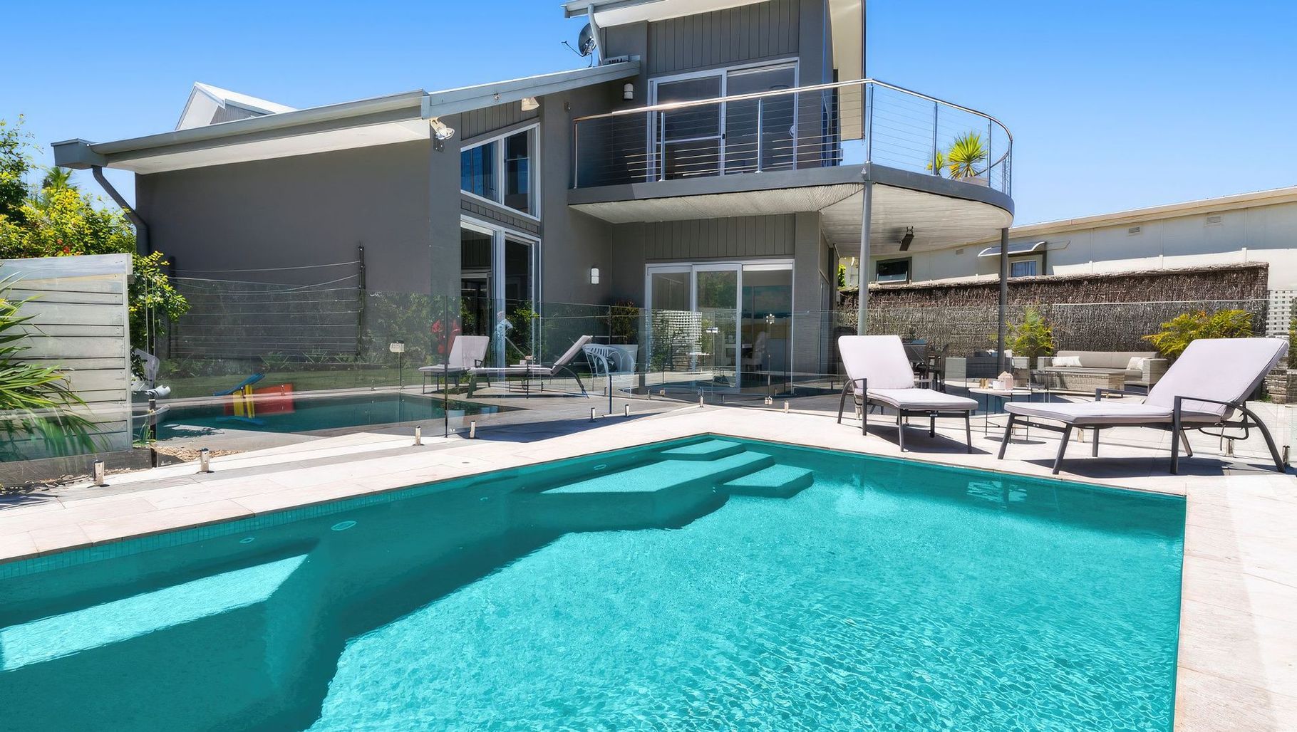 ArchiPro Project Summary - A stunning backyard transformation featuring luxurious emerald green FLG50 and off-white cement for a vibrant tropical aesthetic, expertly crafted by Pools of Distinction for an exceptional finish.