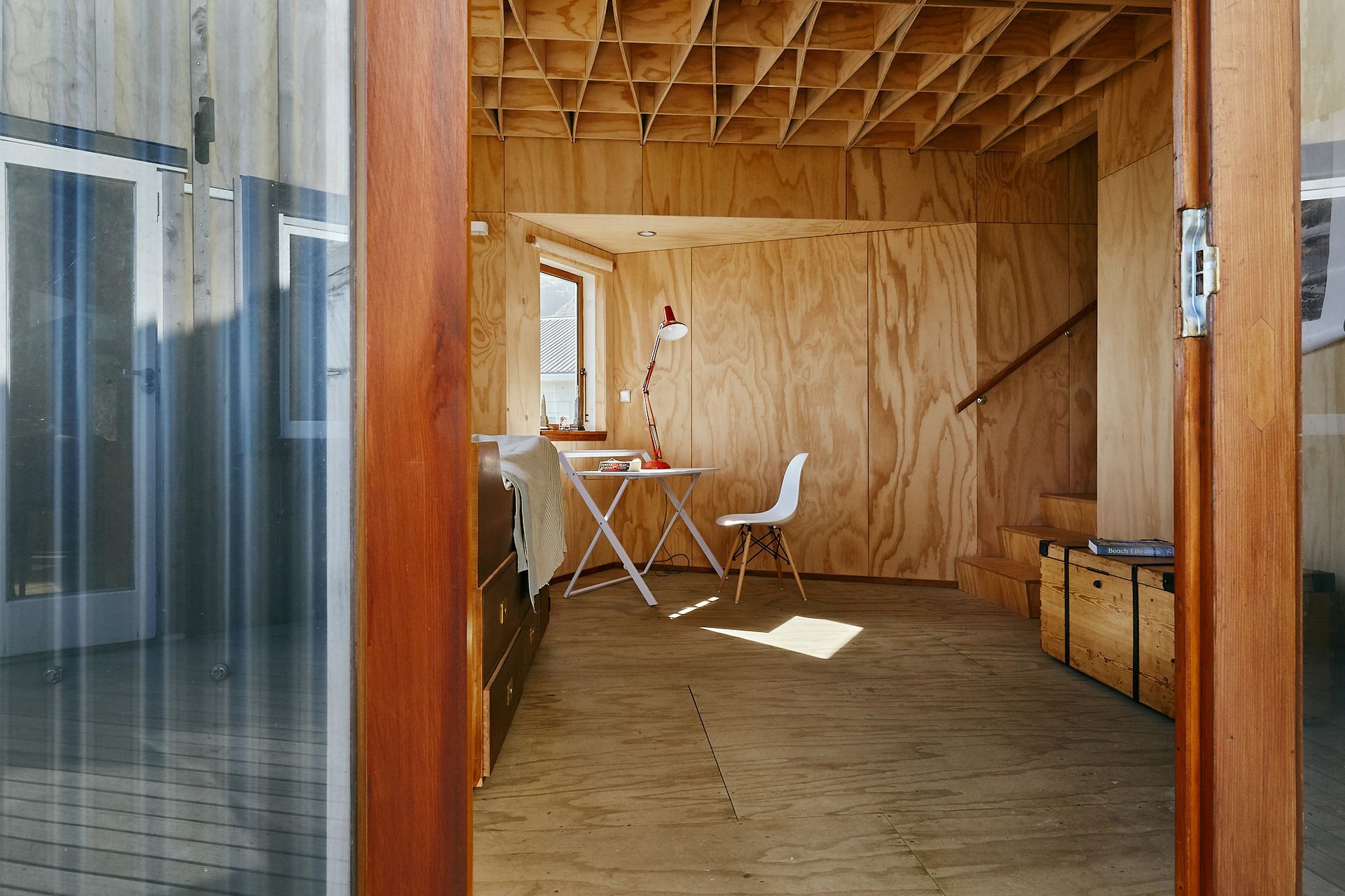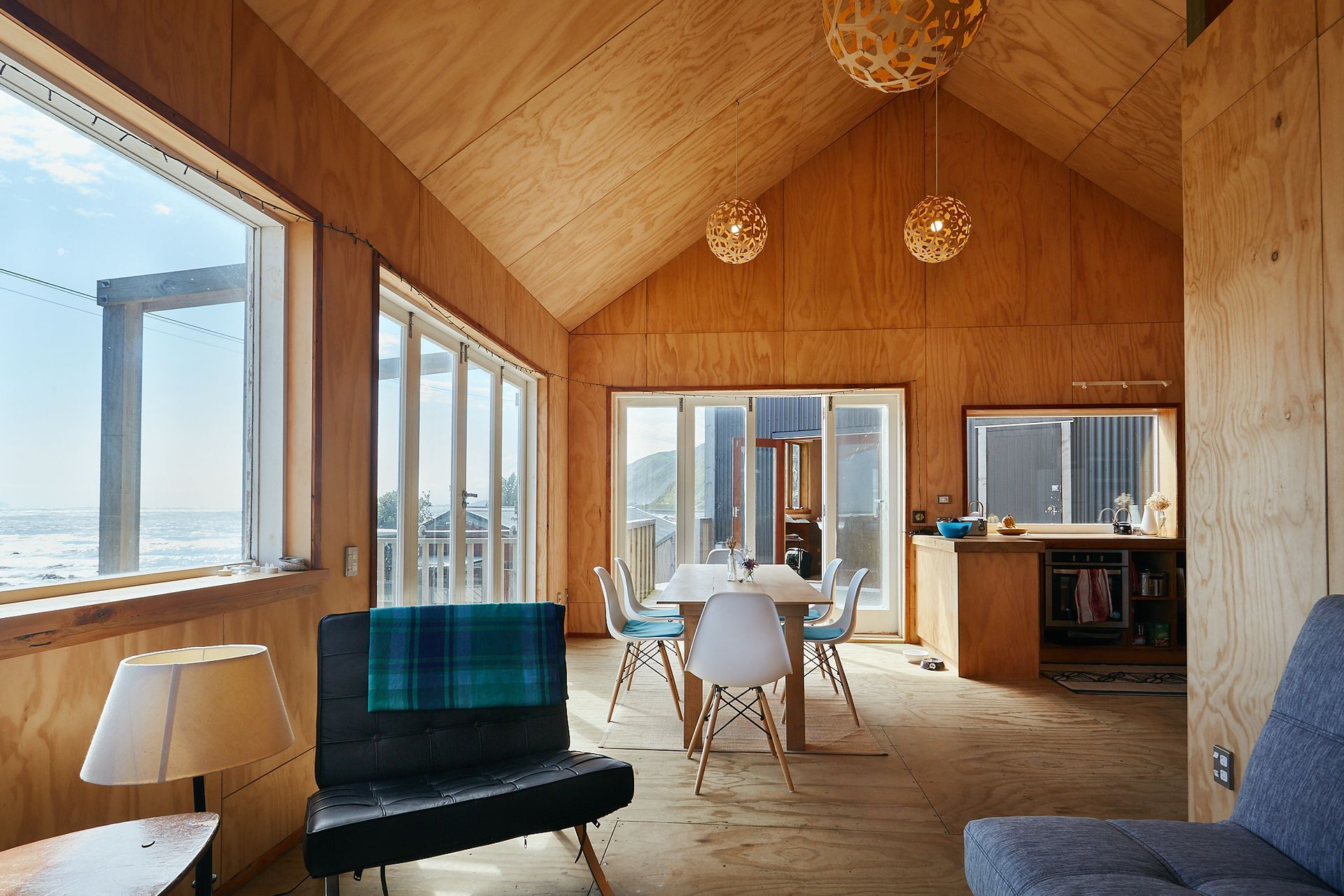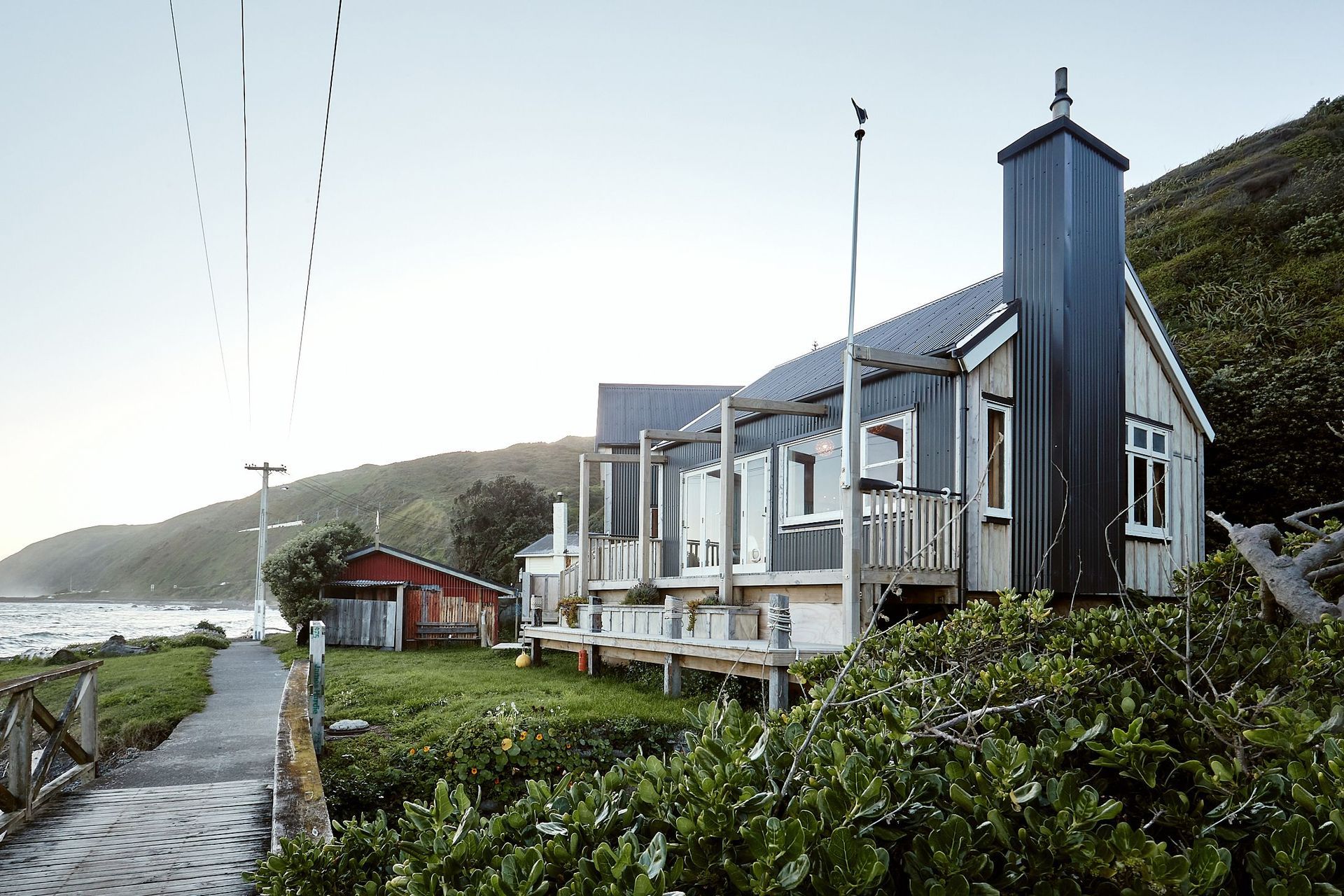 ArchiPro Project Summary - A resilient kiwi bach at Pukerua Bay, harmoniously designed with salvaged materials, featuring two shed-like structures that offer flexible living spaces and stunning 180° views, all while respecting the site's rich history and natural landscape.
