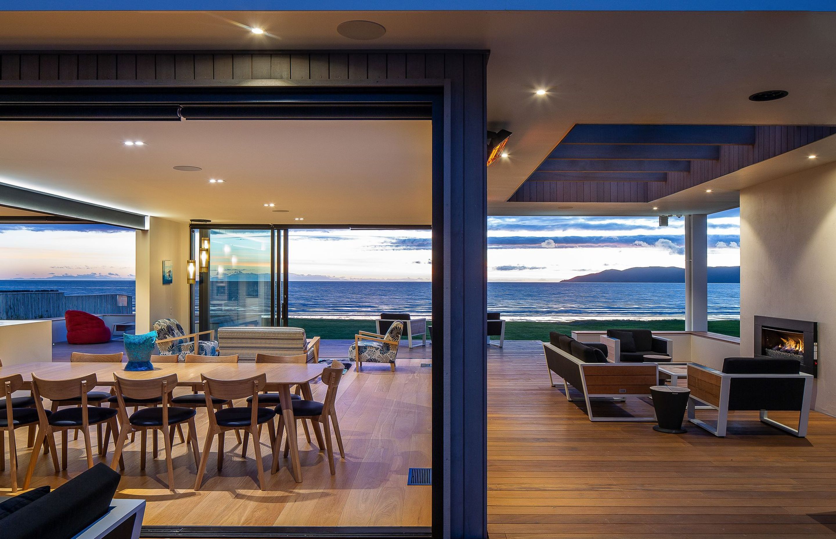 ArchiPro Project Summary - A contemporary beachfront family home in Waikanae, featuring distinct living and bedroom spaces, a central pool, and a harmonious blend of light cedar and white rendered walls, designed to enhance coastal living.